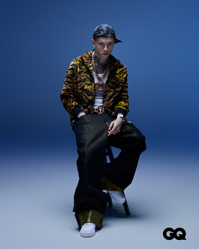 Hooded jacket, tank top, and trousers, Supreme. Beanie, chains, and rings, Central Cee’s own.