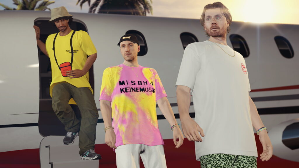 Keinemusik has not only influenced how people dress for the rave but also redefined how rave fashion exists across digital platforms, celebrity culture, and contemporary media. Their appearance in Grand Theft Auto V marked a significant cultural moment, introducing their aesthetic into one of the most influential virtual environments of the past decade. The collective’s in-game styling – developed in collaboration with underground labels such as MISBHV and Civilist – translated their understated, anti-flash sensibility into the digital sphere. It was a rare instance in which rave fashion, traditionally rooted in physical experience, retained its authenticity in a virtual context.