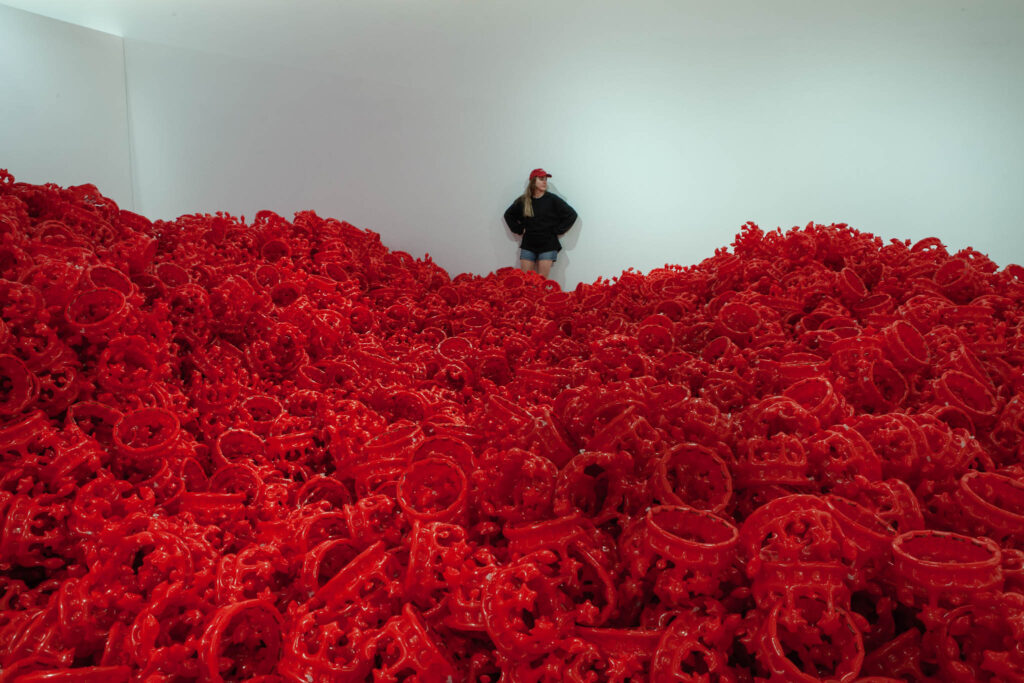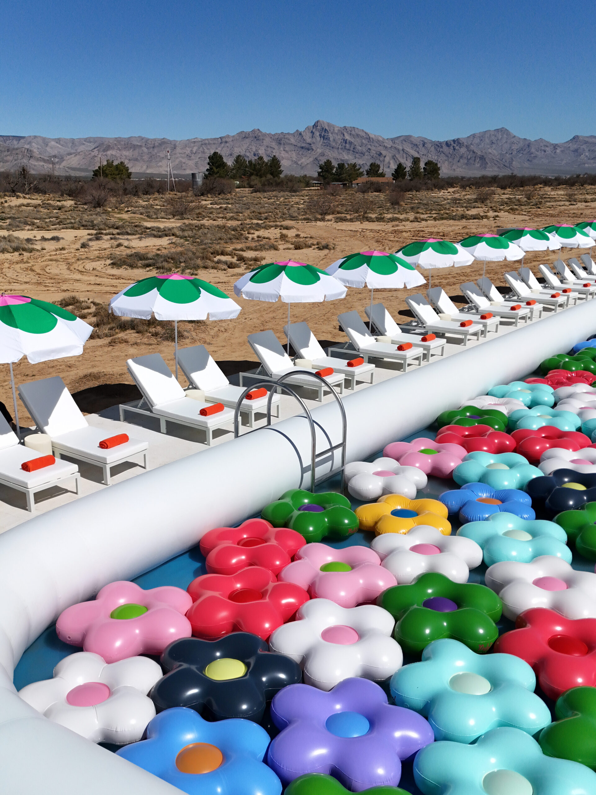 品牌如 Christian Louboutin 在 2017 年與 CJ Hendry 合作,在香港的藝術巴塞展會中,將鞋履與畫作聯乘展出;2023 年與 Phillips Auction House 推出的 Crown 系列,同時為拍賣行的 Dropshop 平台開辟了新局;2024 年在沙漠中設置的 Public Pool 裝置⋯⋯都一一實踐了她的創作理念。