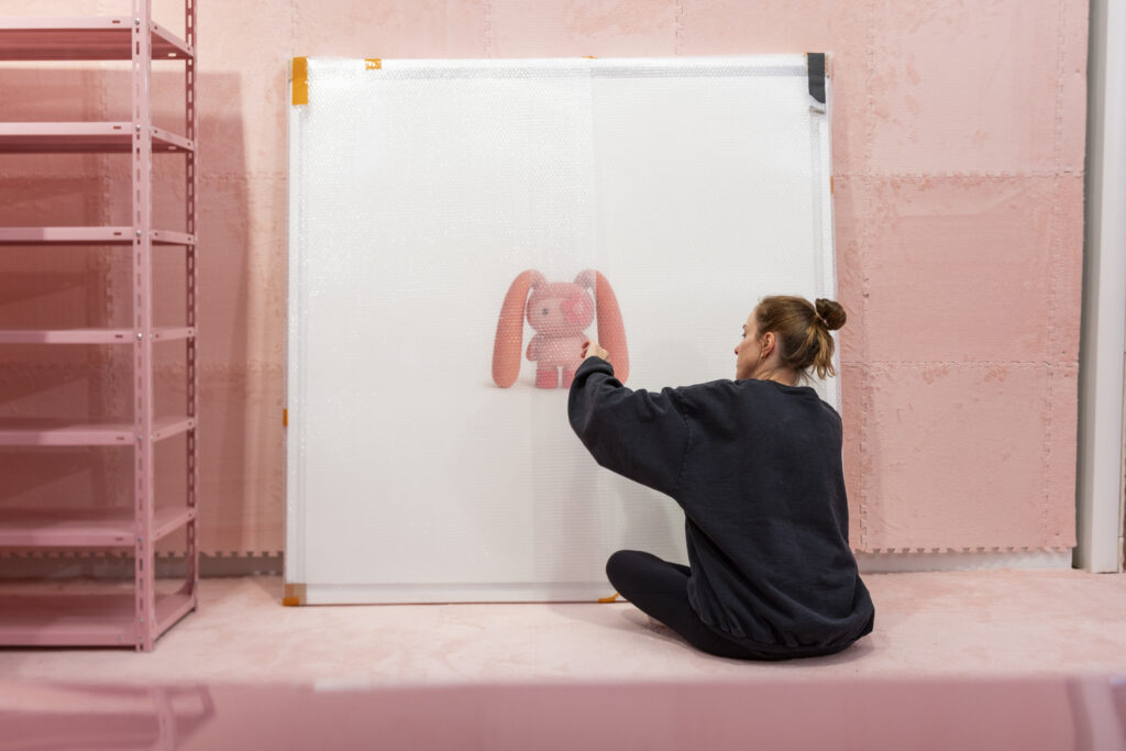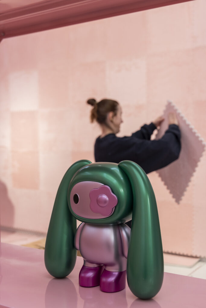 CJ Hendry 當時甚至不知從何入手,她使用了 AI 工具如 ChatGPT 來進行設計,經過多次優化、改進,漫長的 11 個月時間,最終有了 Juju——一個有着垂下來的耳朵、花卉覆蓋眼睛的毛絨玩偶,在展覽期間以盲盒形式發售。「如果有人說,Juju 跟 Labubu 很相似,我會很高興,因為這正是重點。作為一位藝術家,我要創造的,正是這種對話與藝術的反思。」