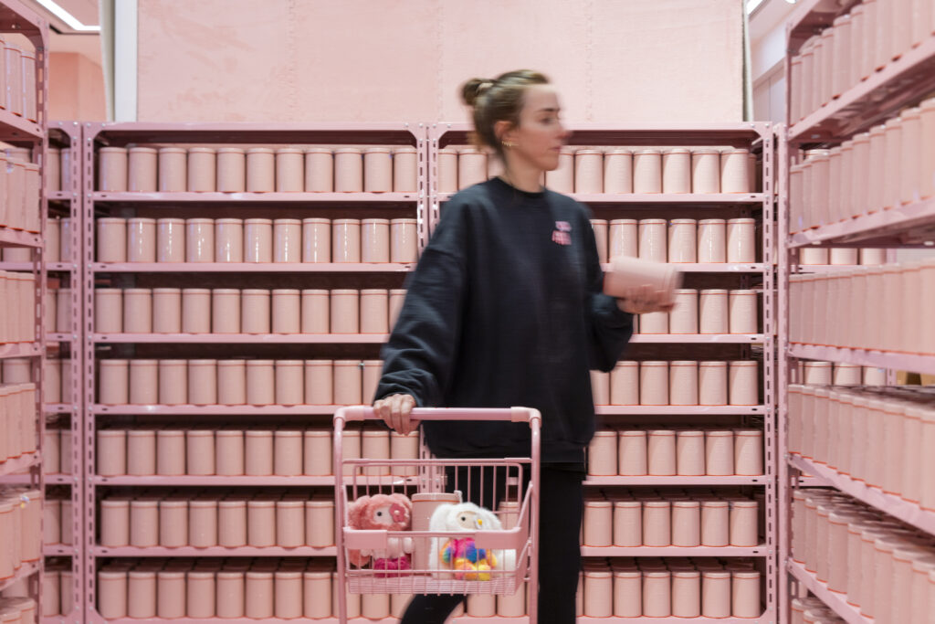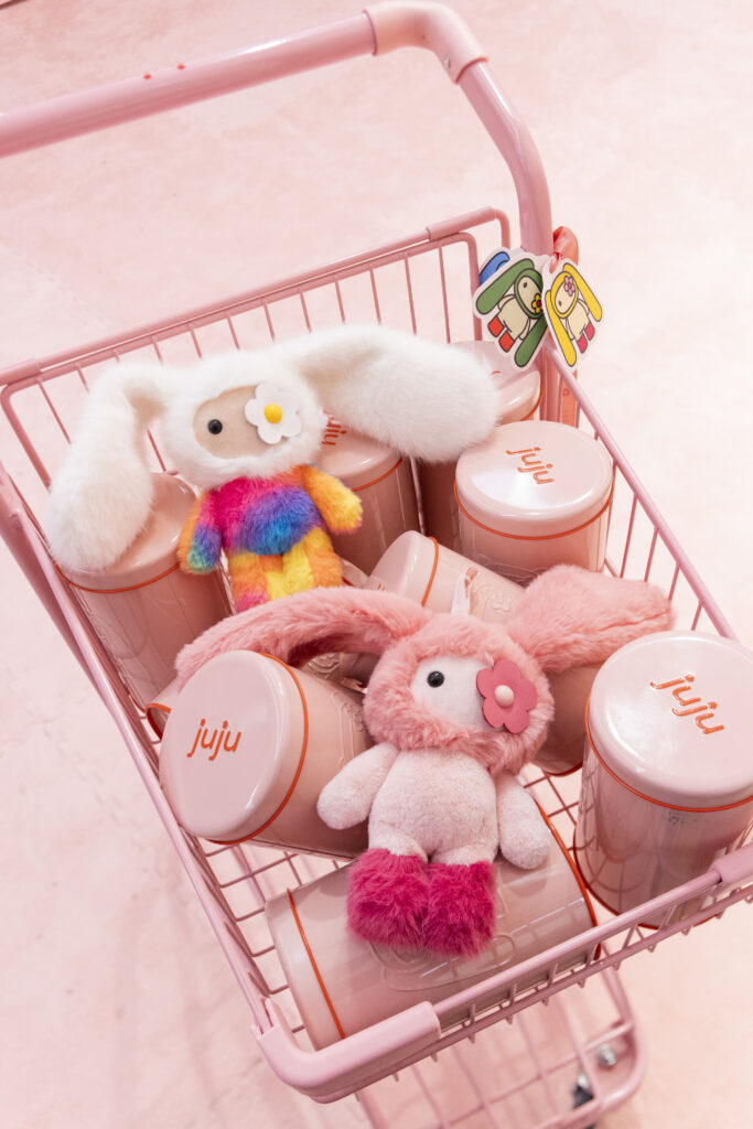 Juju 再一次以消費主義探討了盲盒熱潮,而 CJ Hendry 在回應盲盒熱潮這個議題時,同時亦堅持以最高的質量去完成所有細節,例如以客製化的金屬罐取代紙盒、每一隻玩偶都以她的家人好友命名⋯⋯觀乎展覽開幕當天,開門前早早到場排隊的粉絲,抑或是在「超市貨架」上搜購心頭好的玩具收藏家,「買家」即場「開箱」、與在場互不相識的人們交換心儀的玩偶,這種社群的互動、接觸是 CJ Hendry 作為藝術家更珍視的一環。