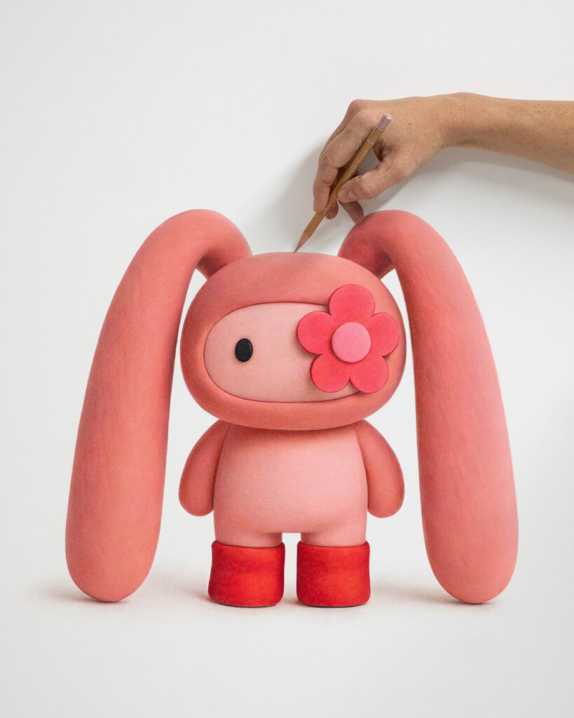CJ Hendry 的最新創作是玩具作品 Juju,再次與 Phillips Auction House 合作,於亞洲總部作快閃展覽,陳列設計模仿超級市場,還有雕塑以及 Juju 本身的超寫實畫作、毛絨玩具盲盒等。Juju 的出現正如她對自己創作生涯的總結一樣:「從來不是故意規劃,一切就像意外般發生的。」年初,Phillips Auction House 表示希望再次與她合作。「他們問我,有聽說過 Crybaby 嗎?有聽說過 Labubu 嗎?他們鼓勵我從這個方向考慮,而我當時根本不知道對方在說甚麼。後來,我開始上網搜尋這些潮流玩具的資料、認識盲盒熱潮⋯⋯到最後,我就想:『我們來做一個玩具吧。』」