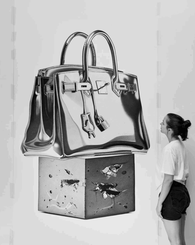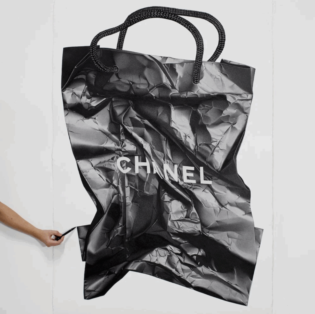 消費主義一直是她創作的核心,大學期間她在名店當兼職售貨員,把所有沉迷於購買各式各樣的根本負擔不起的奢侈品,直至多年來的過度消費讓她銀行帳戶空空如也,就在那一刻,她突然頓悟。 「我想,我肯定能有比這更好的成就吧?」她開始繪畫,而她最初的作品都是以奢侈品為主角,黑白素描的 CHANEL 紙袋、Dior 絲巾、Christian Louboutin 波鞋等。