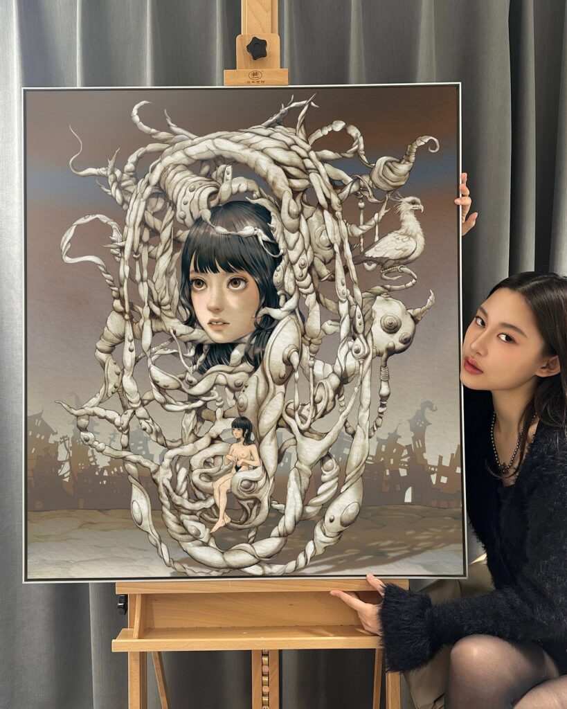 作為 Z 世代的代表人物,她筆下的角色時而天真、時而陰鬱,彷彿在夢境與現實之間不斷切換,訴說著 Z 世代面對成長、身份與虛擬世界交錯的複雜心境。正因如此,她的創作總能在視覺衝擊與情感共鳴之間找到微妙平衡,也讓她成為當代藝術中最難以被定義的年輕聲音之一。
