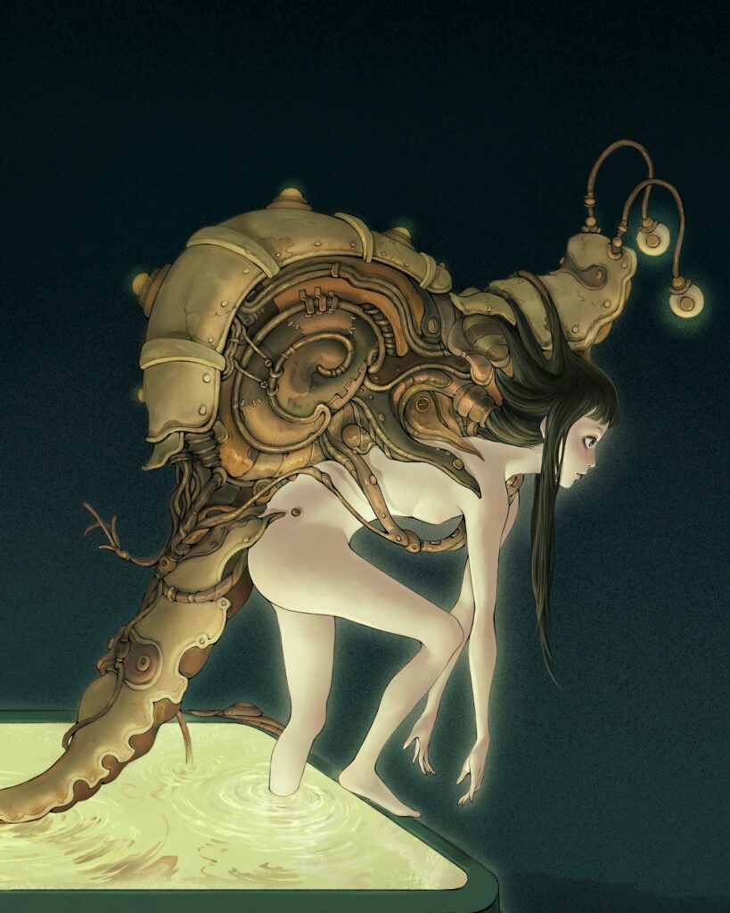 其實我自己的作品一直來源於我自己的個人生活,還有我平時做的一些夢,所以我從小開始到長大之後,我的作品其實演變的沒有特別多,都是根據我小時候的個人經歷和我自己有時候會去臆想一些夢境相關。然後我為什麼會用機械跟少女元素,是因為我從 13 到 14 歲開始,就很喜歡去蒐集很多科幻類型和恐怖類型的漫畫,這些漫畫都有影響到我創作。從那個時候開始 我就開始喜歡上了關於科幻類型的元素。那個時候我也開始喜歡上了像 Giger 這樣的大師,所以從那個時候開始到現在,我慢慢的地鑽研這方面的東西 導致我後來的作品其實一直有機械生物的存在。