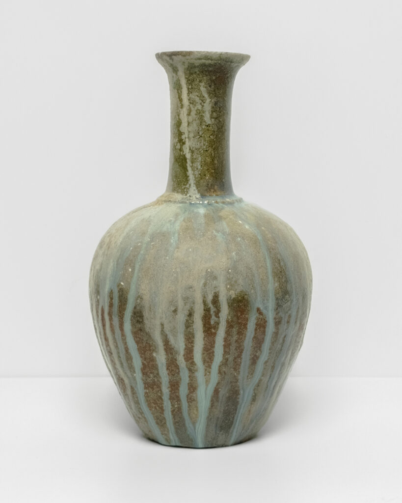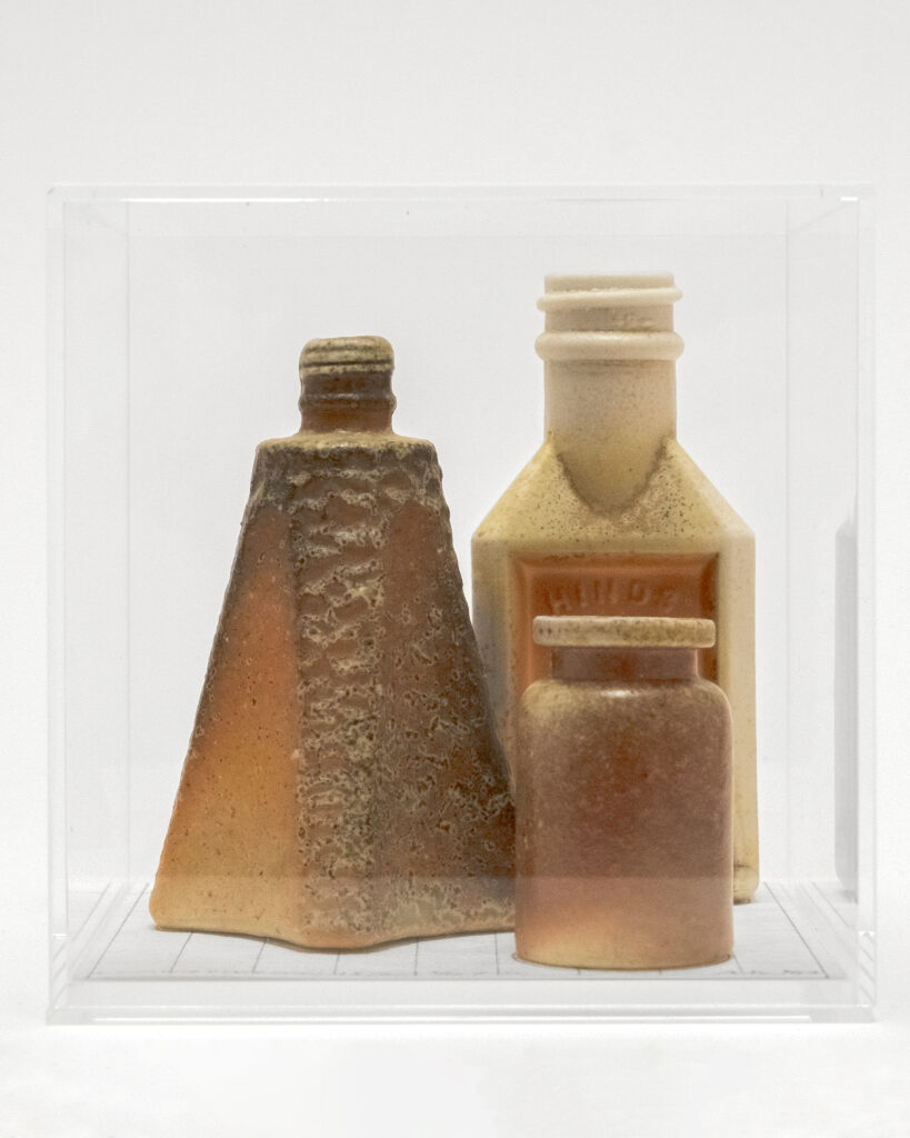 尾花智子以櫥窗雕塑的形式,巧妙地複刻工業量產的器物,像水瓶、香水瓶、藥瓶、酒瓶與果醬瓶等。這些瓶身的原型,或來自古董市集與超市的珍貴遺物,或是朋友贈予的心意之作,來源多元,既帶有濃厚的復古氣息,又融入了當代的生活意象。她用這些經典的器皿作為模版,灌注不同種類的陶泥漿,再經由柴燒的淬煉,讓木柴灰燼在窯中自然落下,形成獨特且不可預料的天然釉彩,猶如自然的紋理在作品表面綻放。