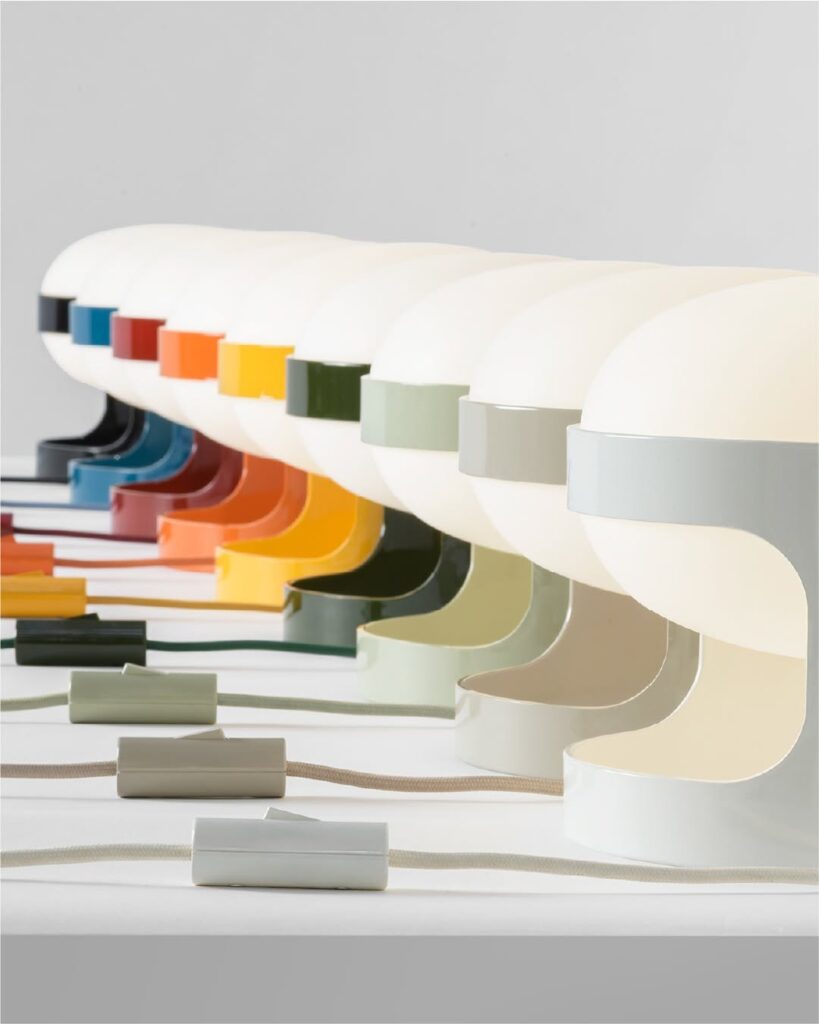 為 Kartell 創作的 KD28 燈具,於 1967 年推出,至 1981 年停產。這位意大利未來主義設計大師將燈具設計得圓潤、俏皮、像一顆發光的小膠囊,完美體現 60 年代「太空時代」熱潮。而且,它可以多盞層疊起來變成燈柱,從小檯燈變成座地燈,靈活配合空間及場景使用,完美演繹了 Joe Colombo 講求產品需具備靈活性、多功能及高度配合使用者生活習慣及空間的設計理念。