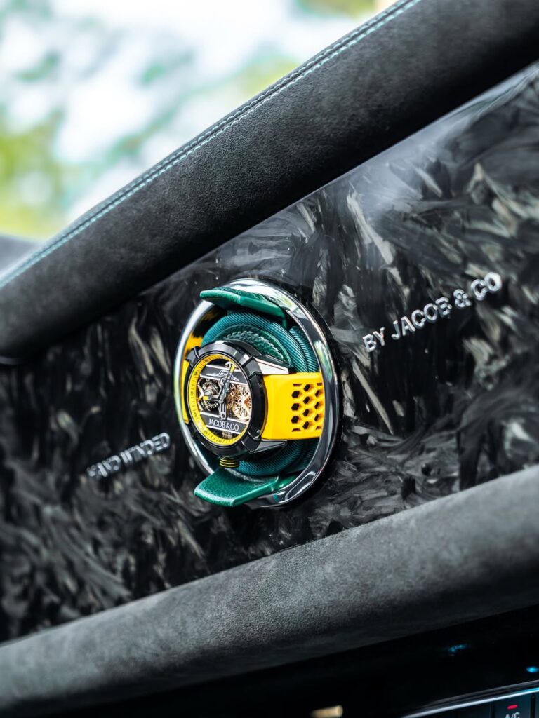 而真正把 Project One 從「瘋狂 restomod」推向「跨領域收藏品」的,是與高級腕錶品牌 Jacob & Co. 的合作。官方形容這是一次把複雜時計美學直接編入車輛細節的聯乘——對熟悉 Jacob & Co. 的人來說,這幾乎是一個非常合理的結合。Jacob & Co. 一向以誇張機械結構和戲劇化設計聞名,從多軸陀飛輪到以超跑引擎為靈感的機芯動畫,品牌的核心就是「把不可能變成可以戴在手上的機械雕塑」。當這種語言轉移到車上,Project One 便不再只是「向 300SL 致敬」的作品,而是一件把車與腕錶美學合併的行走機械雕塑。