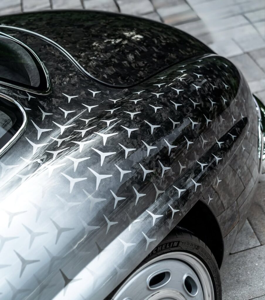 Project One 的出發點看似簡單:以 1950 年代 Mercedes‑Benz 300SL Gullwing 為藍本,保留那對經典鷗翼車門與優雅修長的比例,然後把所有機械與物料徹底現代化。但當你真正走近它,會發現這並不是「翻新一部老 300SL」,而是以當代眼光重寫一個汽車神話——包括車身、動力、內櫳以至概念層面的價值定位。當中最搶眼的,當然是那副全碳纖維車身。Project One 全車以碳纖維打造,尾段及多處細節採用裸露鍛造碳纖維,前半部則披上一層銀色漆面,並在中後段做出由實色漸變至碳纖維紋理的過渡,彷彿一部從傳統世界逐步「解鎖」成未來機械生命體的跑車。更瘋狂的是車身上約 560 顆逐一手繪的平治三芒星徽圖案,遠看像銀河灑落車尾,近看則是匠人高度耐性與工藝的展示,這種處理方式,其實更接近藝術裝置而不是一般汽車塗裝。