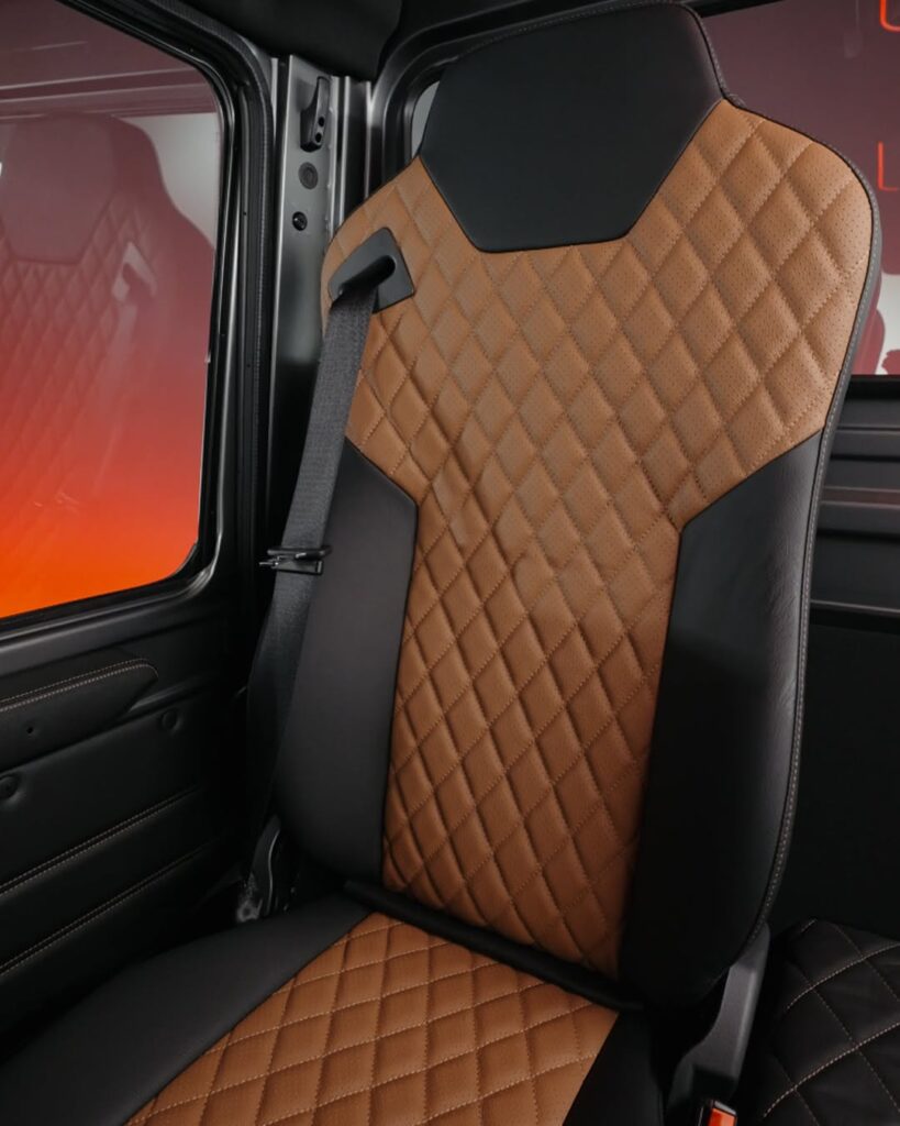 而當你進入車廂,才能真正感受到「勞動草根一夜暴富」的形像轉變。雙排座艙最多可容納四名乘客,所有表面幾乎都被高級皮革覆蓋,並配以對比色縫線。細緻的做工和選材,徹底顛覆了人們對卡車內飾「能用就好」的刻板印象。