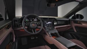 新 Cayenne Electric 車長 4,985 mm、車寬 1,980 mm、車高 1,674 mm。後座乘客擁有前所未有的腿部空間和舒適性,更設有電動座椅調整。新引入的 Mood Modes 將內裝轉變為適應心情和情境的體驗空間。根據選定的程式,座椅位置、照明氛圍、空調、聲音設定和顯示外觀都會改變。另外,Cayenne Electric 將駕駛體驗提升至全新層面,新開發的 Porsche Driver Experience 核心是 Flow Display——優雅彎曲的 OLED 面板,無縫融入中控台,並允許顯示和控制區域的清晰分離。它由 14.25 英寸 OLED 技術的全數位儀表板和 14.9 英寸選配乘客顯示器補充,組合起來,成為保時捷有史以來最大的顯示區域。