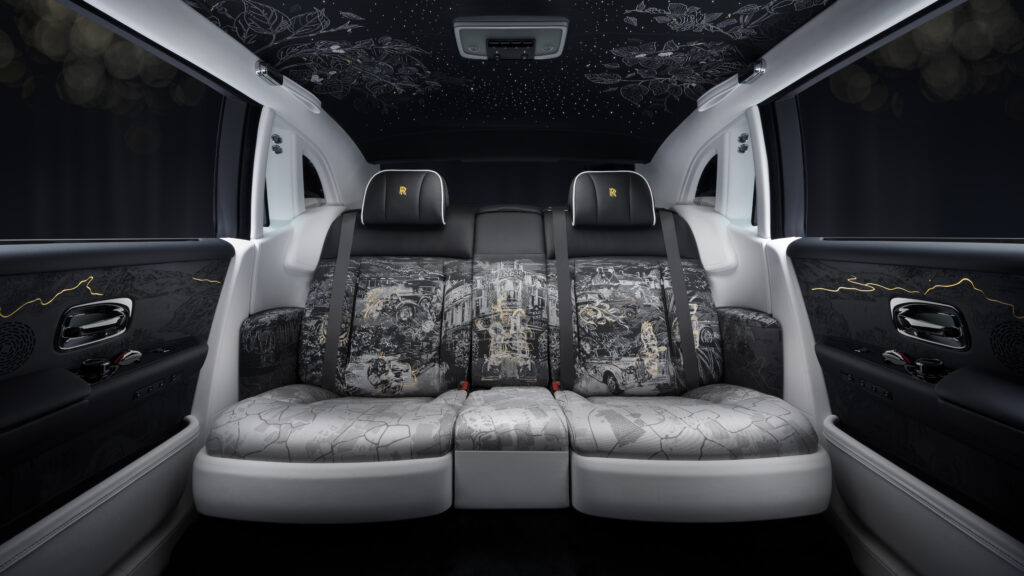 Phantom 後座內飾猶如一本歷史書,以 16 萬針的線繡素描交織出車款的百年故事。這款複雜的編織掛毯由時尚工坊耗時 12 個月共同製作。為滿足勞斯萊斯對耐久性、觸感與美學的追求,工匠們特別調整墨水繪畫,以金色沙灘線與貝殼色線勾勒圖案;而前座皮革採用雷射雕刻技術,呈現訂製設計師的手繪圖案,圖案包括 Roger Rabbit,以紀念 2003 年勞斯萊斯品牌重啟,以及 1923 年幻影一號原型車代號 Seagull 海鷗。