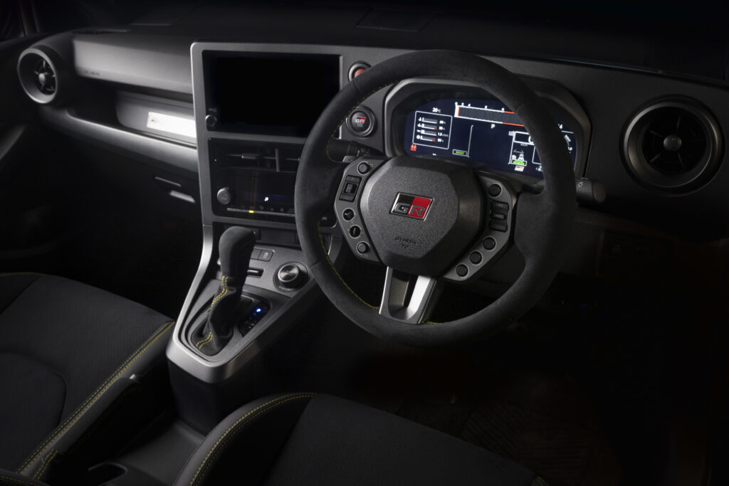 為達成輕量化與高剛性,GR GT 首度採用全鋁合金車體骨架:主要結構使用大型鋁合金鑄件、最佳化鋁擠型材位置,並導入先進接合技術;外覆板則結合鋁合金與 CFRP 碳纖維。懸吊系統前後皆為全新鋁合金雙 A 臂,輪胎選用 Michelin 專屬開發的 Pilot Sport Cup 2;煞車系統搭載 Brembo 碳纖維碟盤,動態控制亦由職業車手共同調校。