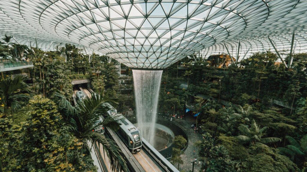 被譽為「世界最美機場」的星耀樟宜雨漩渦,絕對值得專程造訪。最令人讚歎的莫過於中央的星耀瀑布,座擁 40 米高的世界最高室內瀑布,被繁茂的綠植環繞。當夜幕降臨,搭配絢麗的聲光秀,更是美得令人屏息。