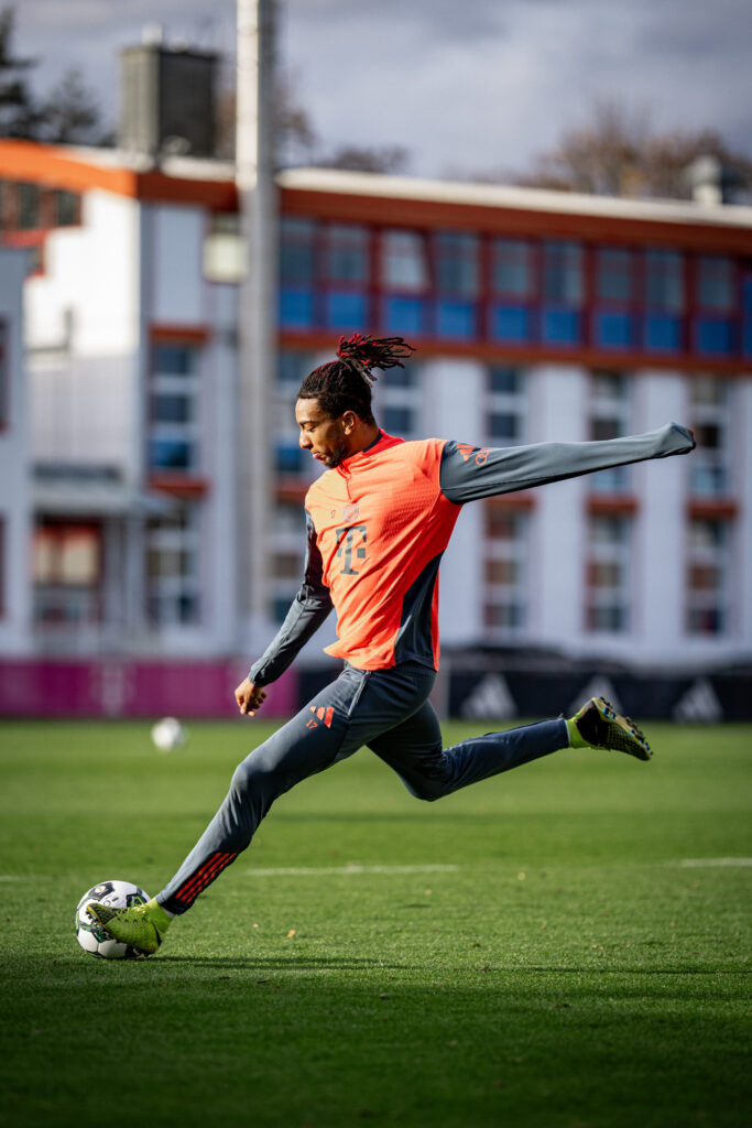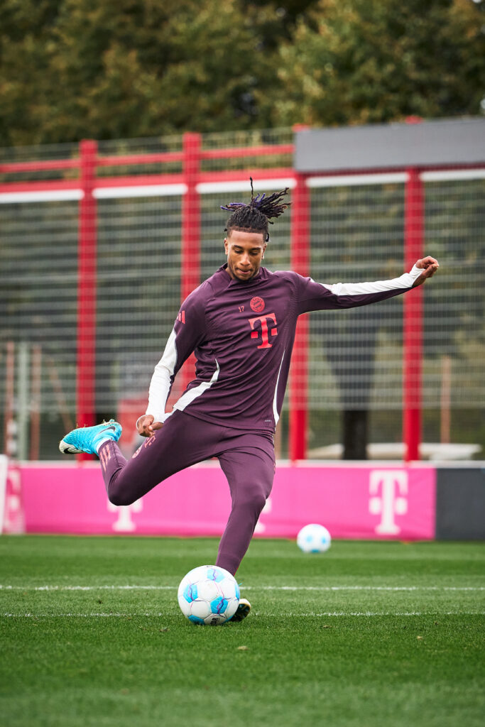MUNICH, GERMANY – OCTOBER 28: (EDITORS NOTE: Image has been digitally enhanced.) Michael Olise of FC Bayern Muenchen shoots the ball during a training session at the Saebener Strasse training ground in Munich, southern Germany, on October 28, 2025 in Munich, Germany. (Photo by N. Klemt/FC Bayern via Getty Images)