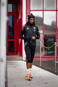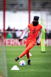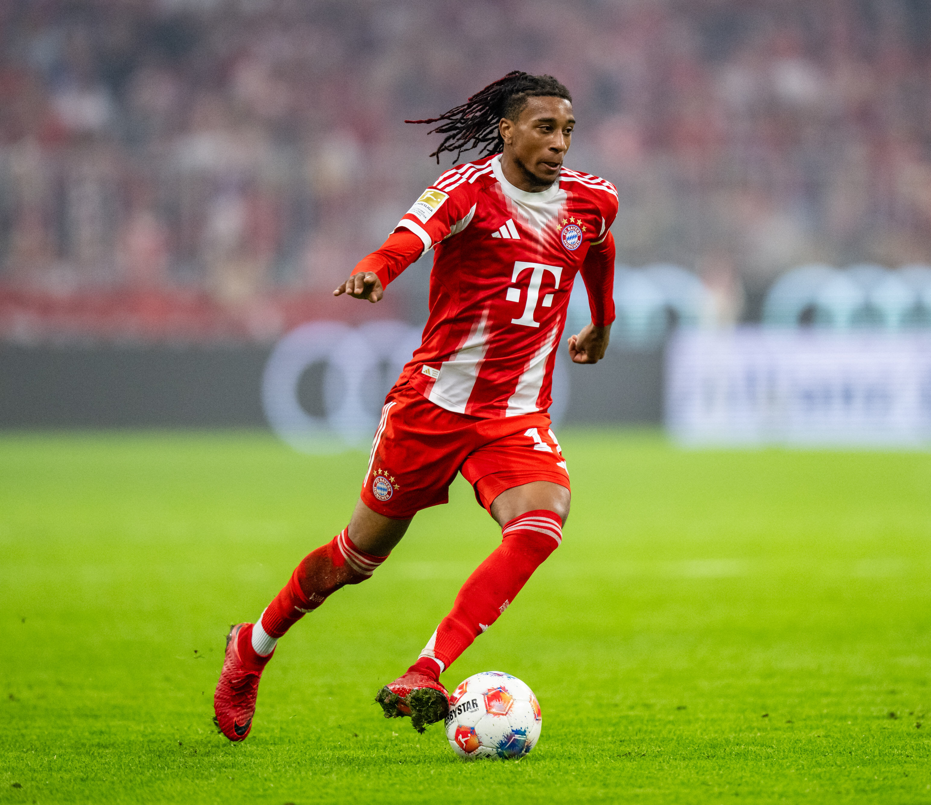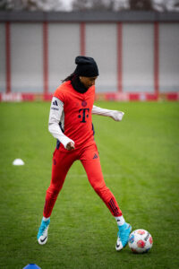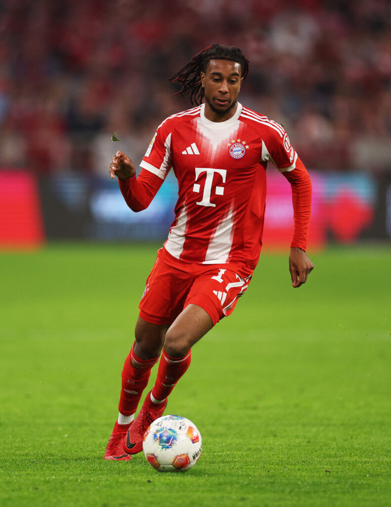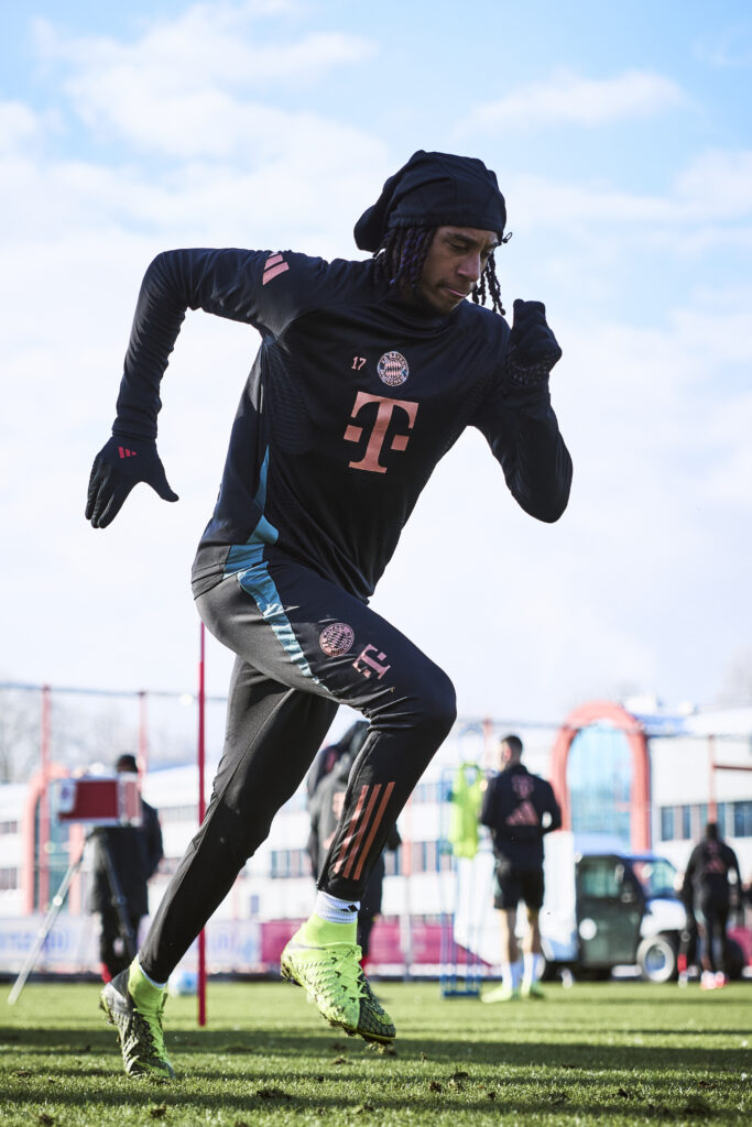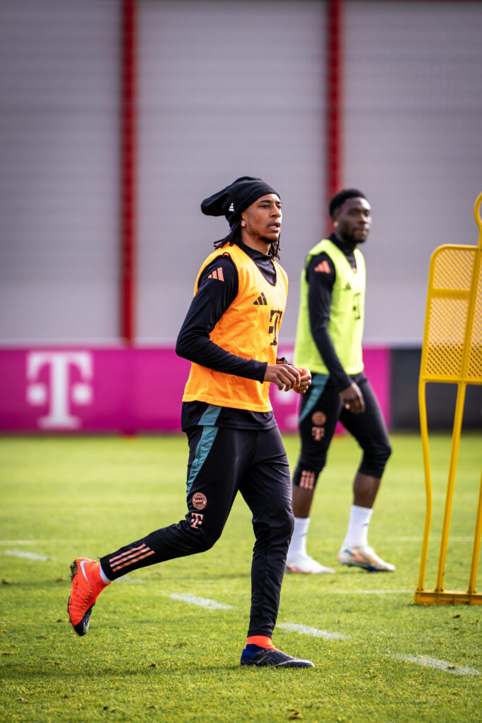 MUNICH, GERMANY – FEBRUARY 27: (EDITORS NOTE: Image has been digitally enhanced.) Michael Olise of FC Bayern Muenchen enters the pitch before during a training session at the Saebener Strasse training ground in Munich, southern Germany on February 27, 2025 in Munich, Germany. (Photo by R. Mitterer/FC Bayern via Getty Images)