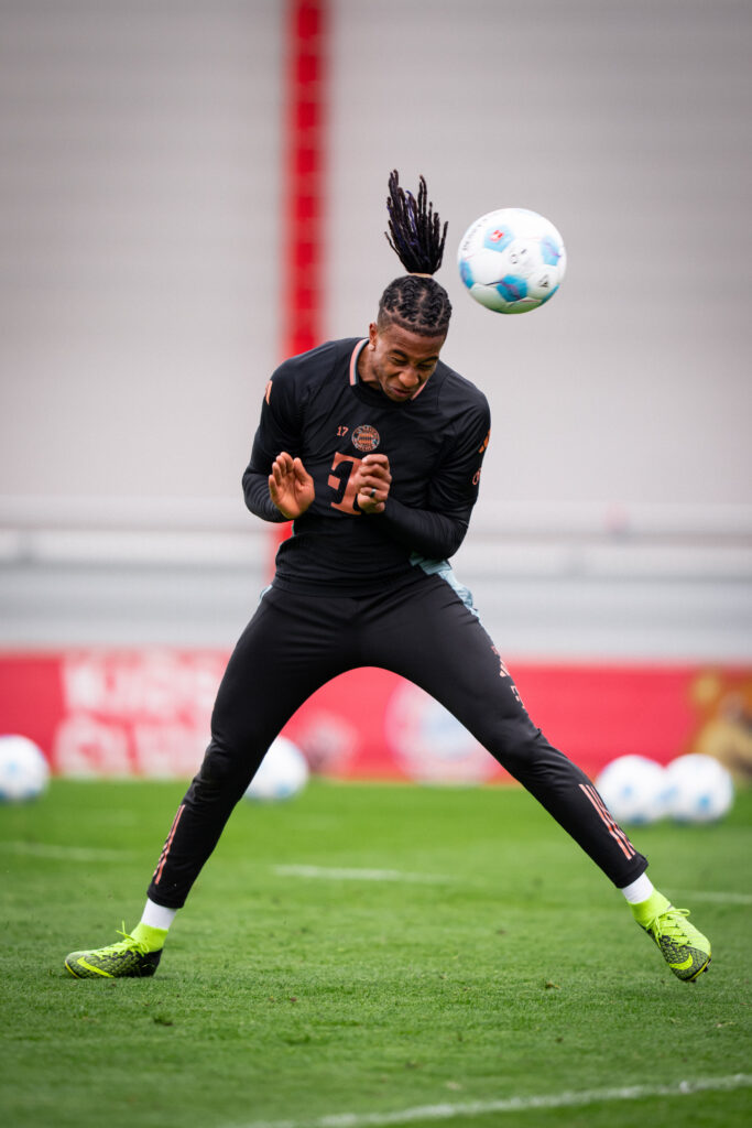 MUNICH, GERMANY – APRIL 25: (EDITORS NOTE: Image has been digitally enhanced.) Michael Olise of FC Bayern Muenchen heads the ball during a training session at on April 25, 2025 in Munich, Germany. (Photo by F. Noever/FC Bayern via Getty Images)