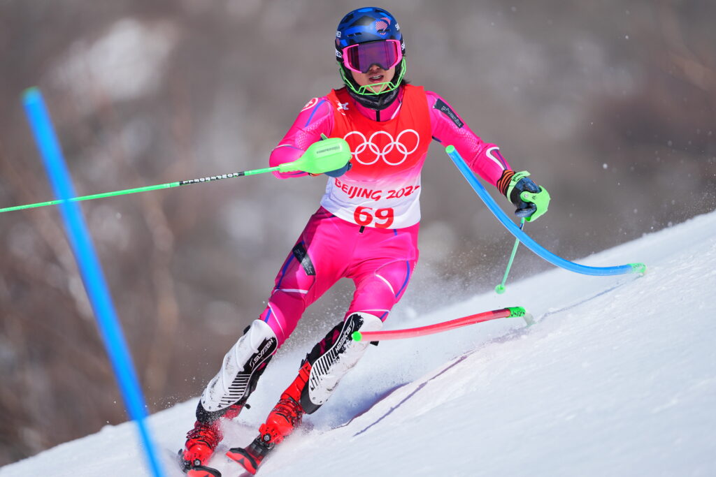 16 February 2022, China, Yanqing: Olympics, Alpine Skiing, Slalom, Men, 1st run at the National Alpine Ski Center, Adrian Yung from Hong Kong, China in action. Photo: Michael Kappeler/dpa (Photo by Michael Kappeler/picture alliance via Getty Images)