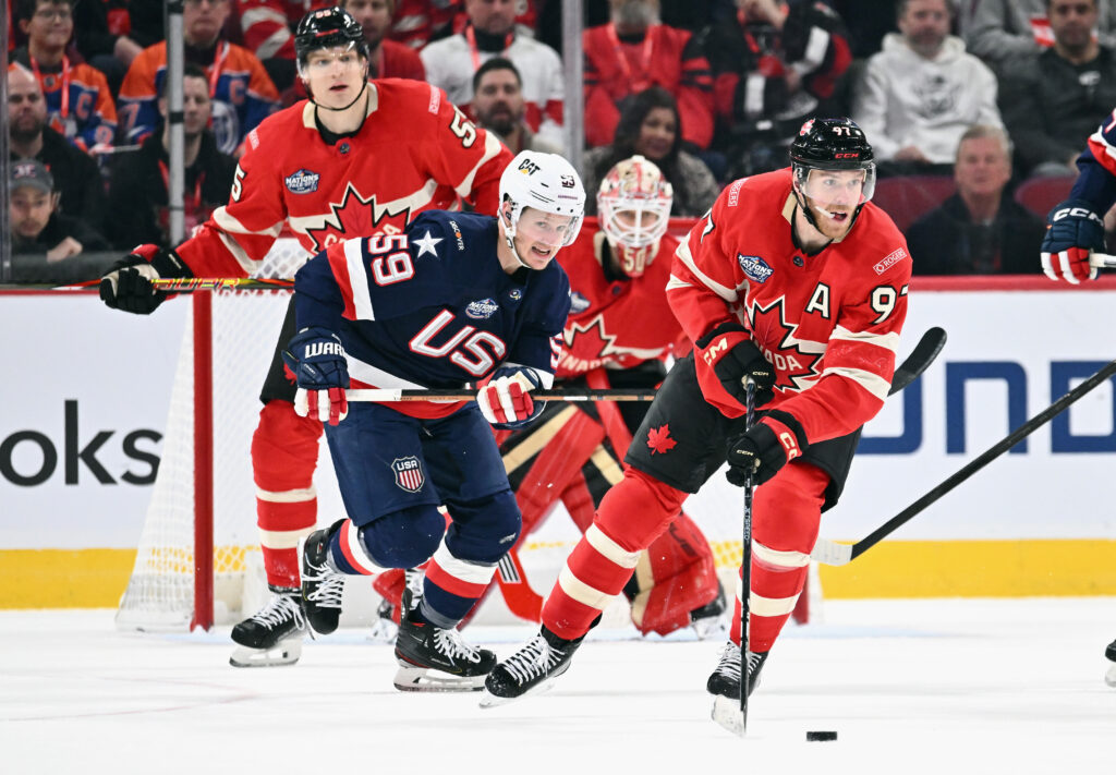MONTREAL, CANADA – FEBRUARY 15: Jake Guentzel #59 of Team USA skates against Connor McDavid #97 of Team Canada during the second period in the 4 Nations Face-Off game at the Bell Centre on February 15, 2025 in Montreal, Quebec, Canada. (Photo by Minas Panagiotakis/Getty Images)