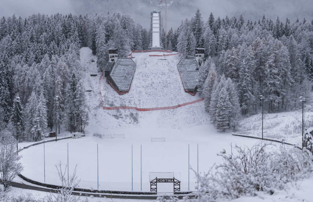 CORTINA D’AMPEZZO, ITALY – NOVEMBER 21: The Cortina Football ground and Ski Jumping Arena are seen on November 21, 2025 in Cortina d’Ampezzo, Italy. Cortina D’Ampezzo is a Host City for the upcoming Milano Cortina 2026 Winter Olympics and will host Sliding, Curling and Women’s Alpine events. (Photo by Ryan Pierse/Getty Images)