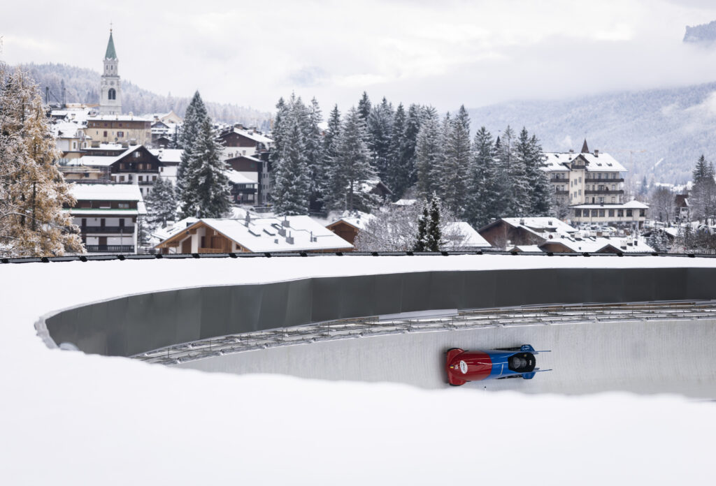 CORTINA D’AMPEZZO, ITALY – NOVEMBER 20: Team Romania on track during a Bobsleigh practice session at Eugenio Monti Sliding Center on November 20, 2025 in Cortina d’Ampezzo, Italy. (Photo by Ryan Pierse/Getty Images)