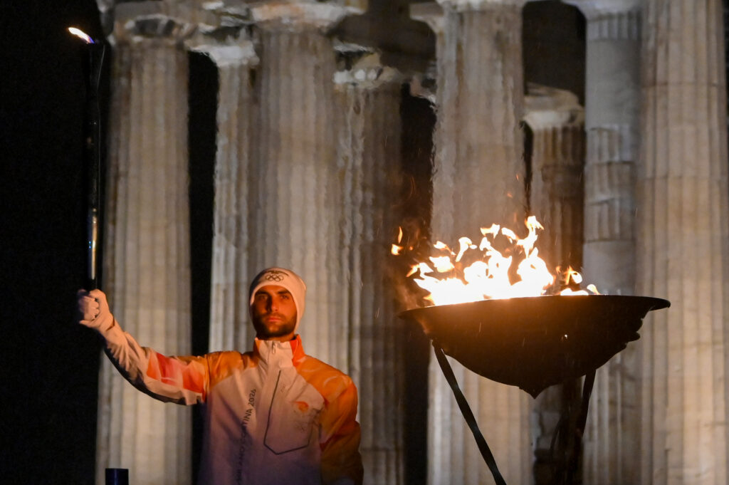 ATHENS, GREECE – DECEMBER 3: Greek rower Stefanos Ntoukos lights a cauldron with the Olympic flame in front of the Parthenon Temple atop the Acropolis, as part of the Greek torch relay of the Olympics Flame for the Milano Cortina 2026 Olympic Winter Games on December 3, 2025 in Athens, Greece. (Photo by Milos Bicanski/Getty Images)