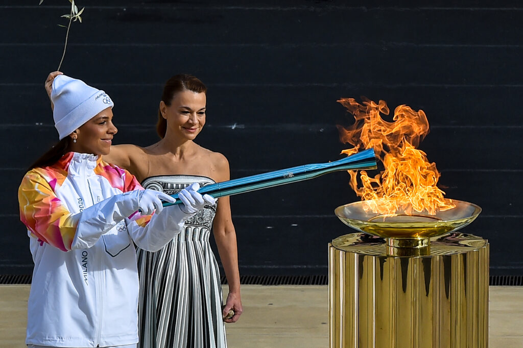ATHENS, GREECE – DECEMBER 04: World Water Polo Champion Eleni Xenaki lights a cauldron with the Olympic flame during the Olympic Flame Handover Ceremony for the Milano Cortina 2026 Winter Games on December 04, 2025 in Athens, Greece. (Photo by Milos Bicanski/Getty Images)