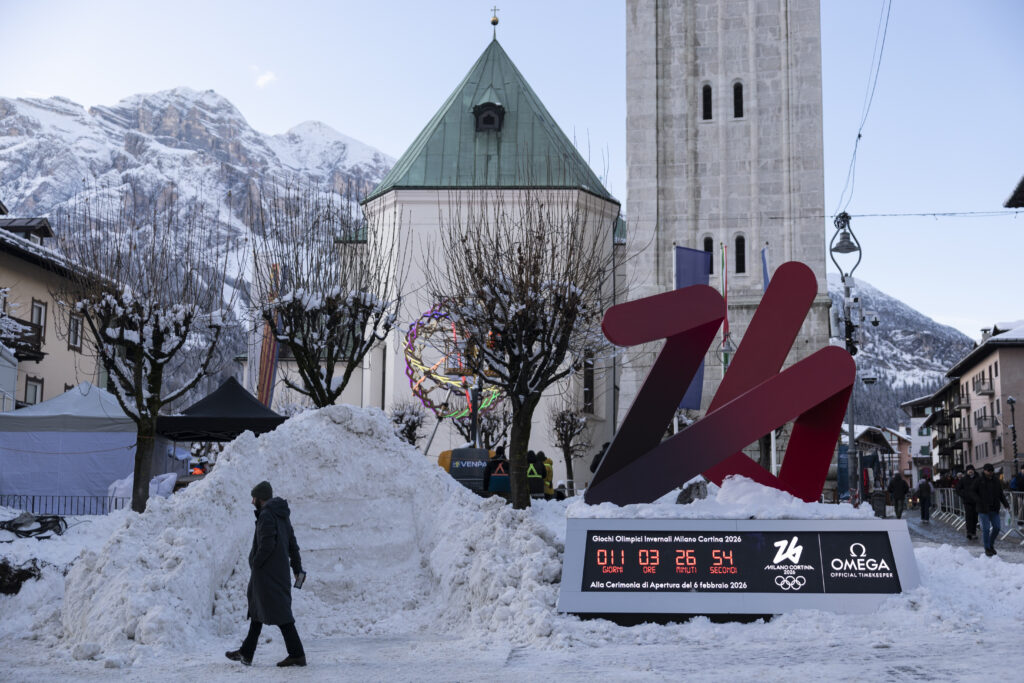 CORTINA D’AMPEZZO, ITALY – JANUARY 26: A general view of the Omega Countdown Clock ahead of the Milano Cortina 2026 Winter Olympics on January 26, 2026 in Cortina d’Ampezzo, Italy. (Photo by Maja Hitij/Getty Images)