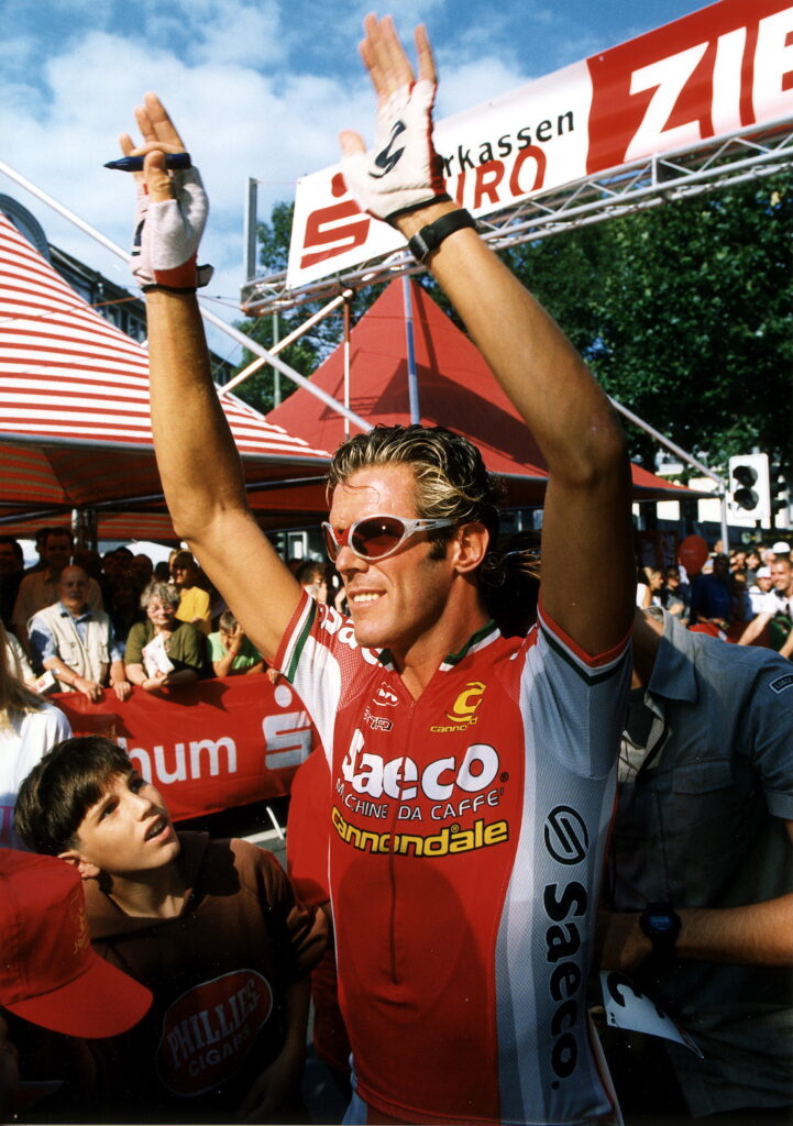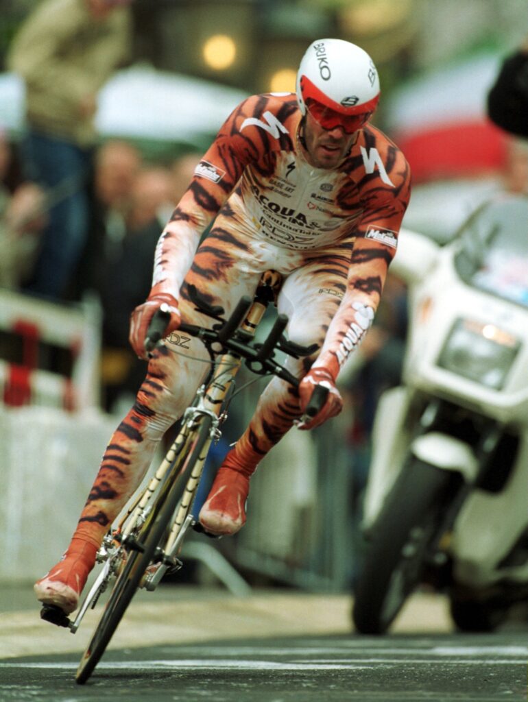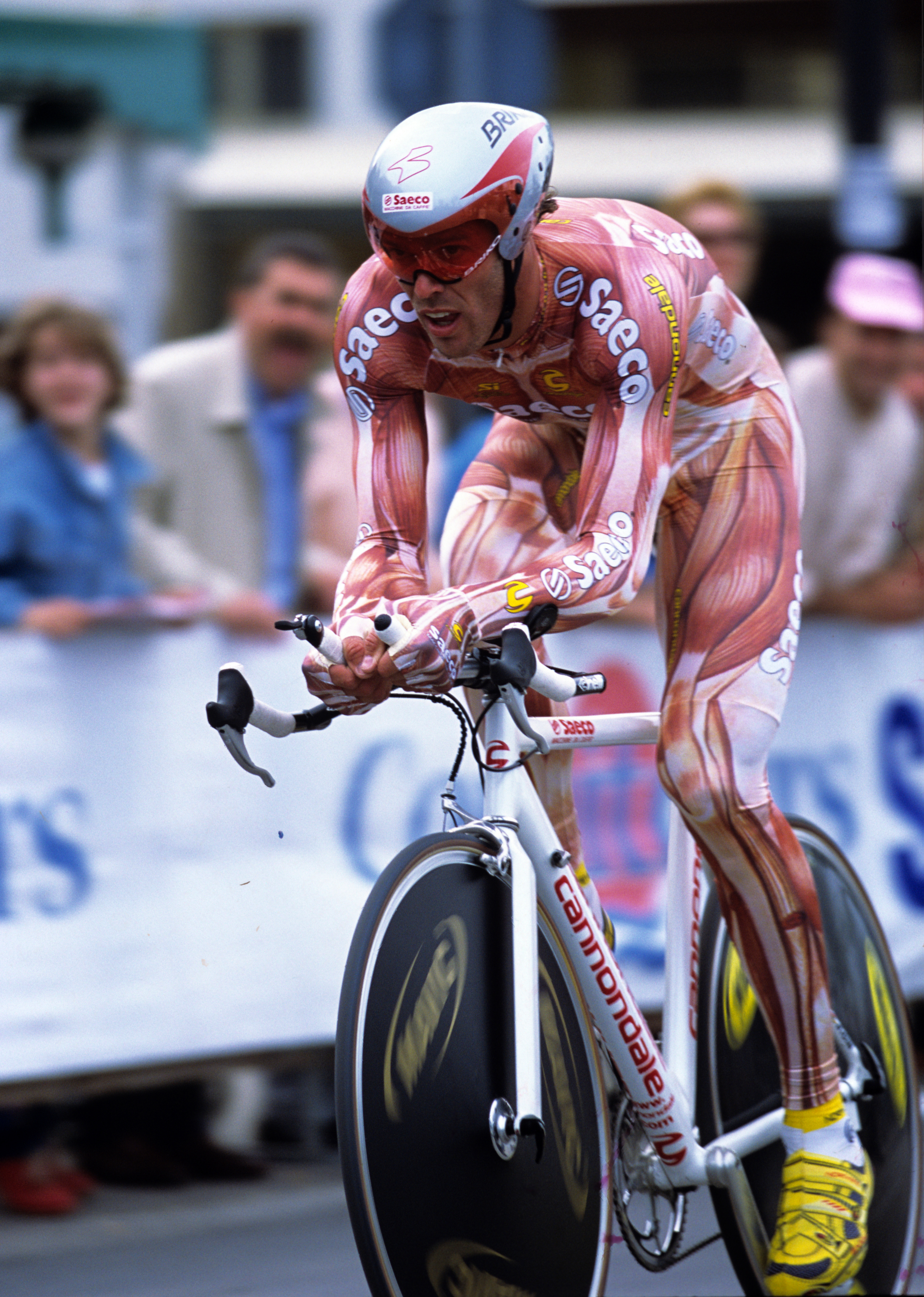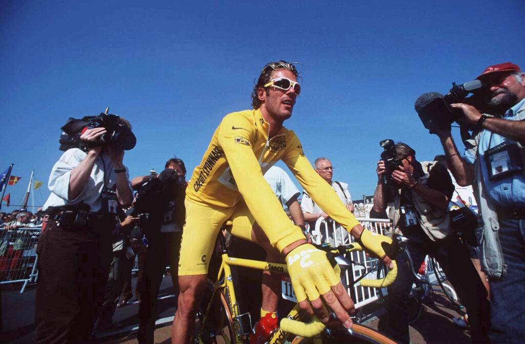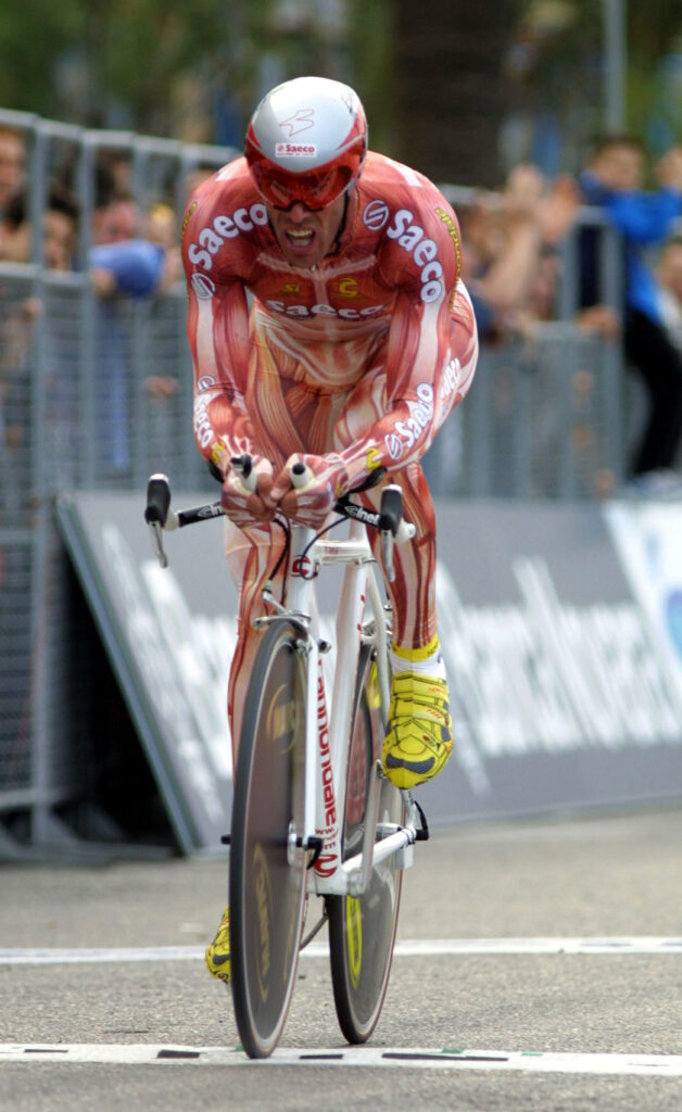 在 2001 年環意單車賽(Giro d’Italia)的起跑線上,所有車手都被包裹在五顏六色、印滿商業標誌的緊身衣,宛如一塊塊移動的廣告牌。而在這令人窒息的沉悶中,一個身高一米八九、金髮隨風飄揚的男人緩緩褪去外袍。那一瞬間,現場的快門聲瘋狂作響,而出現在眾人眼前的,是一具彷彿被活生生剝去皮膚、將鮮紅肌肉與錯綜複雜的血管完全暴露於空氣中的「進擊的巨人」。