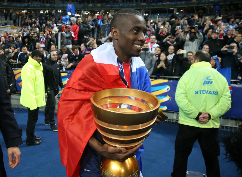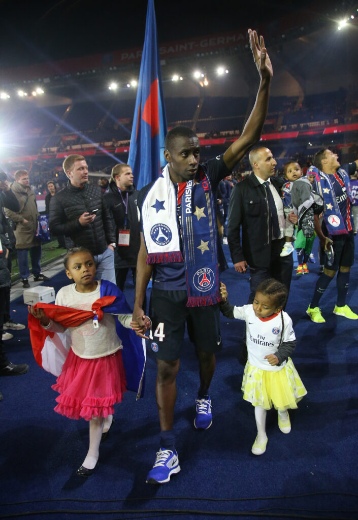 PARIS, FRANCE – MAY 30: Thiago Silva, Zlatan Ibrahimovic, Blaise Matuidi and Zoumana Camara of PSG lift the 4 trophies PSG won this season (Ligue 1 championship, French Cup, French Ligue Cup, Trophy of Champions) after the French Cup Final between Paris Saint-Germain (PSG) and AJ Auxerre at Stade de France on May 30, 2015 in Saint-Denis nearby Paris, France. (Photo by Jean Catuffe/Getty Images)PARIS, FRANCE – MAY 14: Blaise Matuidi celebrates with his daughters Myliane Matuidi and Naelle Matuidi winning the French Ligue 1 championship following the French Ligue 1 match between Paris Saint-Germain (PSG) and FC Nantes at Parc des Princes stadium on May 14, 2016 in Paris, France. (Photo by Jean Catuffe/Getty Images)