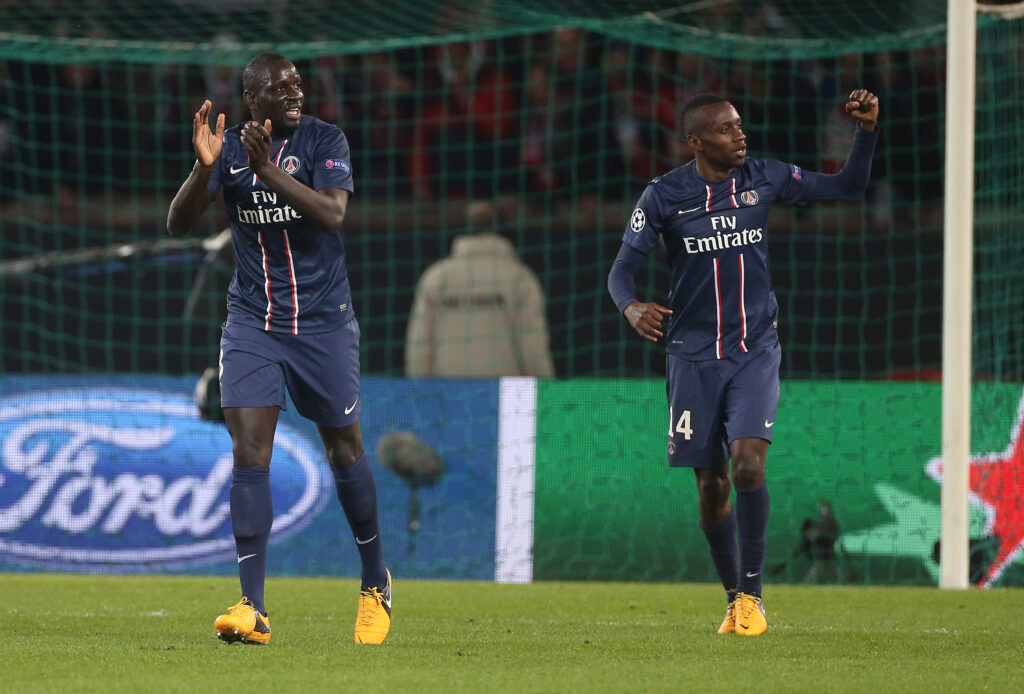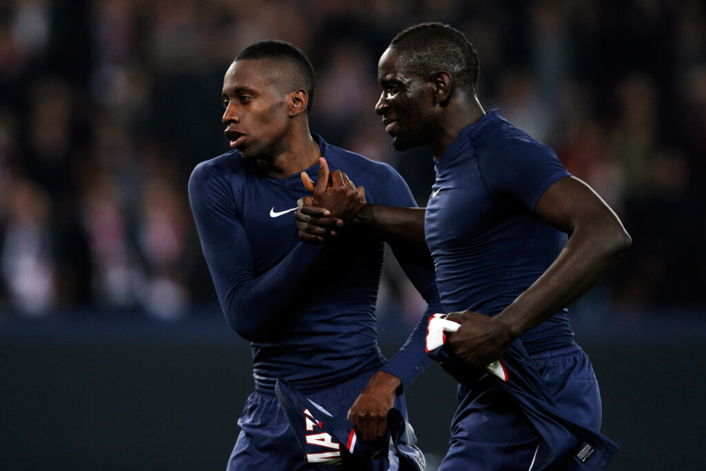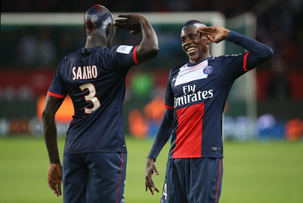 PARIS, FRANCE – MAY 18: Blaise Matuidi of PSG celebrates his goal along Mamadou Sakho (L) during the Ligue 1 match between Paris Saint-Germain FC and Stade Brestois 29 at the Parc des Princes stadium on May 18, 2013 in Paris, France. (Photo by John Berry/Getty Images)
