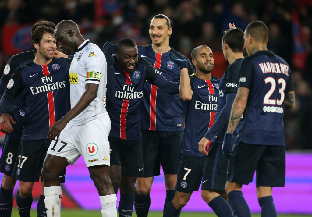 PARIS, FRANCE – JANUARY 23: Lucas Moura of PSG (R) celebrates his goal with Maxwell Scherrer, Blaise Matuidi and Zlatan Ibrahimovic of PSG during the French Ligue 1 match between Paris Saint-Germain (PSG) and SCO Angers at Parc des Princes stadium on January 23, 2016 in Paris, France. (Photo by Jean Catuffe/Getty Images)