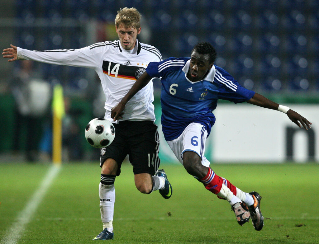 MAGDEBURG, GERMANY – OCTOBER 10: Germany’s Aarin Hunt (L) in action against Blaise Matuidi of France during the UEFA U21 Championship Playoff Match between Germany and France at the stadium Magdeburg on October 10, 2008 in Magdeburg, Germany. (Photo by Ronny Hartmann/Bongarts/Getty Images for DFB)