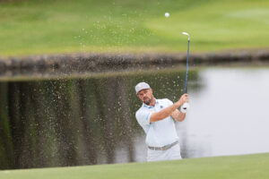Captain Bryson DeChambeau of Crushers GC hits his shot from a bunker on the 18th hole during the practice round before the start of the LIV Golf Hong Kong at Hong Kong Golf Club Fanling on Tuesday, March 03, 2026 in Fanling, Hong Kong. (Photo by Chris Trotman/LIV Golf)