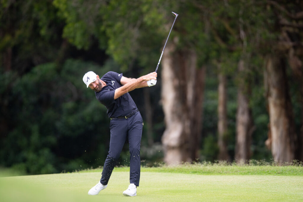 Captain Dustin Johnson of 4Aces GC hits his shot on the second hole during the practice round before the start of the LIV Golf Hong Kong at Hong Kong Golf Club Fanling on Tuesday, March 03, 2026 in Fanling, Hong Kong. (Photo by Mike Stobe/LIV Golf)