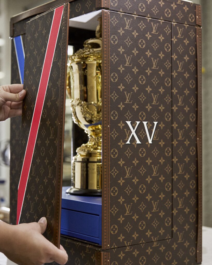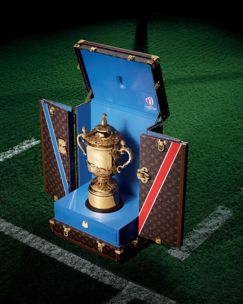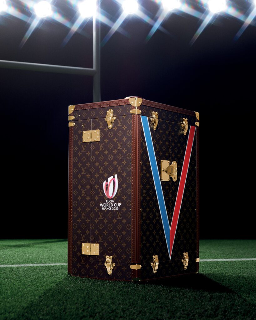 繼 2015 年首次合作後,Louis Vuitton 再度成為 2023 年法國橄欖球世界盃(Rugby World Cup France)的官方獎盃旅行箱供應商,為 Webb Ellis Cup 訂製專屬旅行箱。這款手工打造的作品採用 Monogram 帆布,融入賽事色調,並於側面注入代表 15 人制陣容的羅馬數字「XV」,前方面板飾以藍、白、紅三色手繪「V」字,呼應法國國旗與賽事標誌,內裡則採用與「V」字相同的 Pantone 藍色皮革襯裡。這不僅開創品牌獎盃旅行箱的新篇章,更象徵勝利與工藝的完美結合。