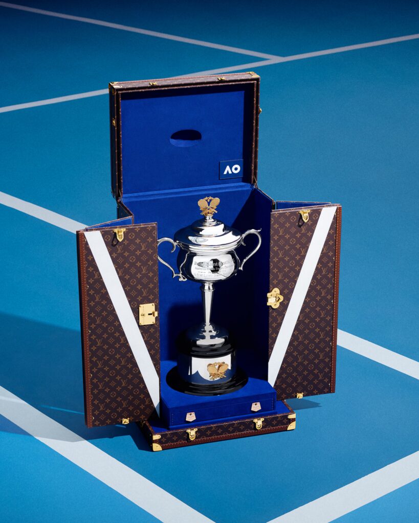 Louis Vuitton 已連續多年擔任澳洲網球公開賽(Australian Open)的官方獎盃旅行箱合作夥伴,為男子單打獎盃「Norman Brookes Challenge Cup」及女子單打獎盃「Daphne Akhurst Memorial Cup」訂製專屬作品,並於決賽及頒獎典禮中亮相。旅行箱覆蓋經典 LV Monogram 帆布,前方面板飾以醒目白色「V」字圖案,象徵「Victory」與「Vuitton」,內裡採用藍色微纖維襯裡,呼應澳網標誌性的藍色硬地球場色調,箱蓋內側更印有白色「AO」標誌。