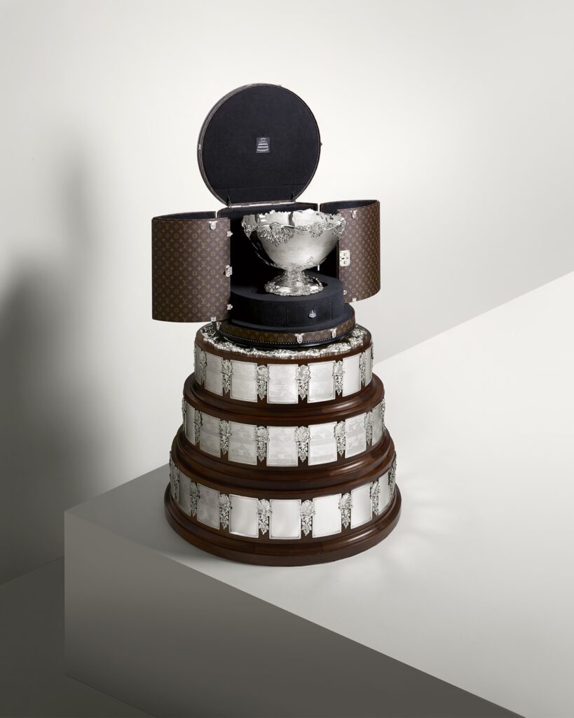 2022 年,台維斯盃 (Davis Cup)獎盃首次置於 Louis Vuitton 訂製的旅行箱中亮相,這標誌著品牌與這項歷史悠久賽事的第三年合作。旅行箱採用經典 Monogram Macassar 帆布覆蓋,擁有獨特的圓形輪廓,完美契合獎盃的超大底座,可從頂部及兩側開啟,瞬間變成絕佳的展示平台。