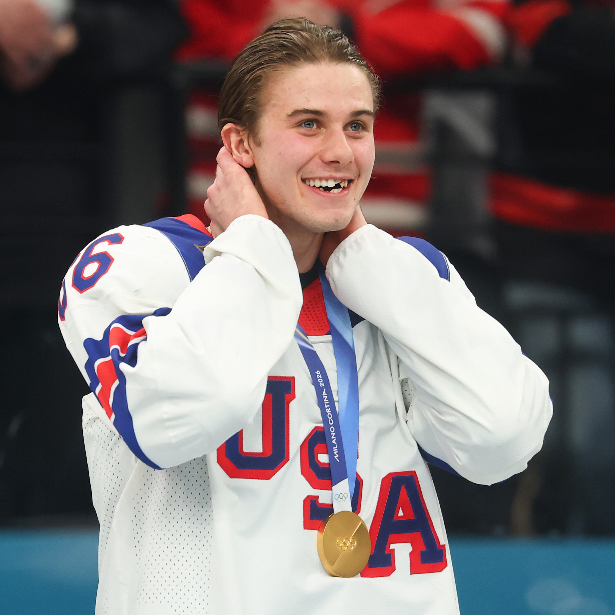 MILAN, ITALY - FEBRUARY 22: Gold medalist Jack Hughes #86 of Team United States smiles during the medal ceremony for Men's Ice Hockey after winning the Men's Gold Medal match between Canada and the United States on day 16 of the Milano Cortina 2026 Winter Olympic games at Milano Santagiulia Ice Hockey Arena on February 22, 2026 in Milan, Italy. (Photo by Gregory Shamus/Getty Images)