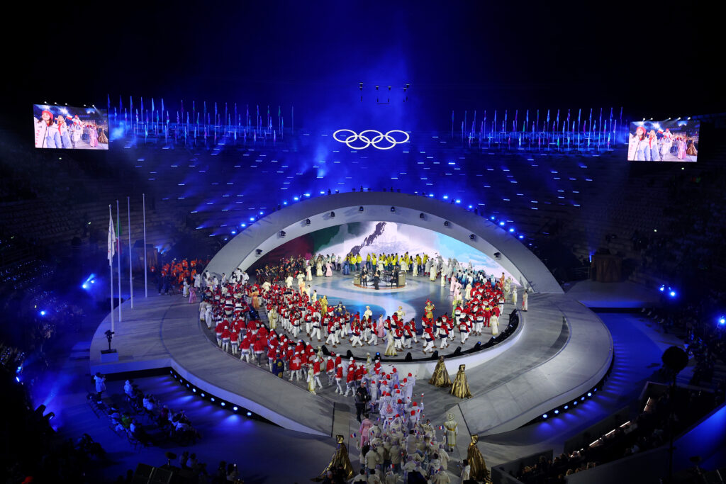 VERONA, ITALY – FEBRUARY 22: A general view of the athlete parade during the Milano Cortina 2026 Winter Olympics Closing Ceremony on day sixteen of the Milano Cortina 2026 Winter Olympic games at Verona Olympic Arena on February 22, 2026 in Verona, Italy. (Photo by Dean Mouhtaropoulos/Getty Images)