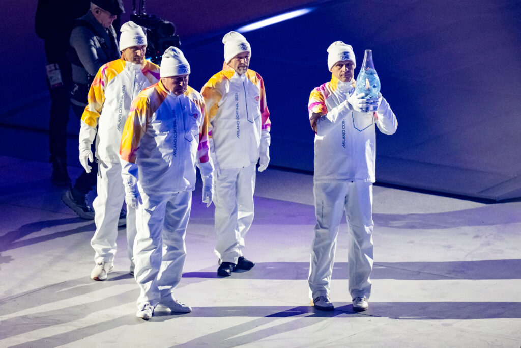 VERONA, ITALY – FEBRUARY 22: The 1994 4x10km Relay Cross-Country Ski Olympic Champions Maurilio De Zolt, Marco Albarello, Giorgio Vanzetta, and Silvio Fauner of Team Italy carry the Drop of Fire during the Closing Ceremony on day 16 of the Milano Cortina 2026 Winter Olympic Games at Verona Arena on February 22, 2026 in Verona, Italy. (Photo by Kevin Voigt/GettyImages)