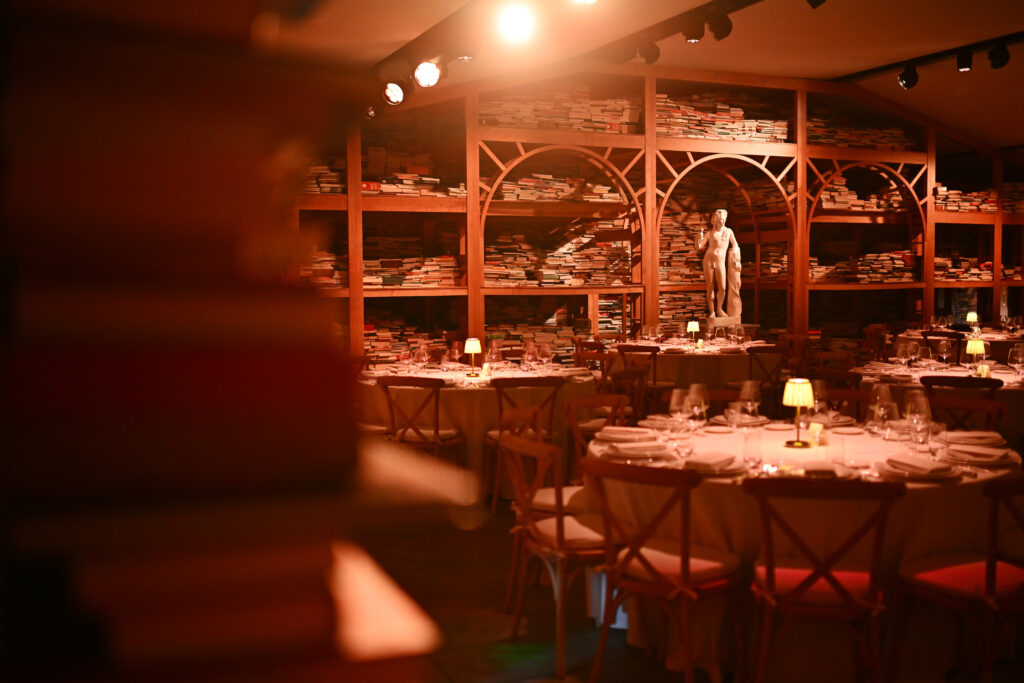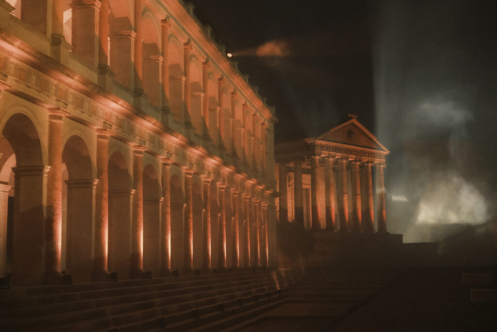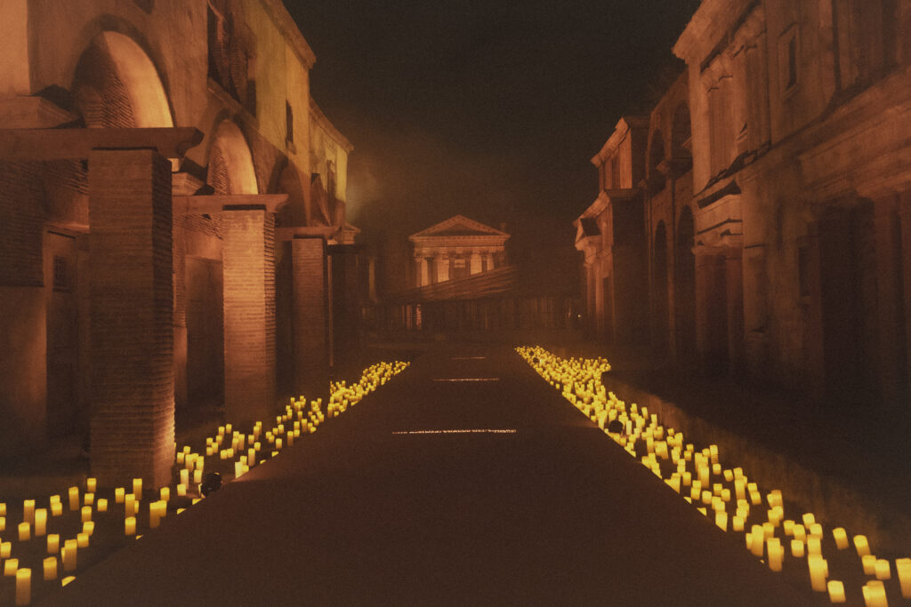 放映會結束後,品牌在影城舉行了一場盛大的晚宴,以慶祝這位設計師及品牌的重要時刻。嘉賓與近千名賓客一同步行到重現羅馬古蹟的電影佈景中,沿途受 Brunello Cucinelli 先生對哲愛的所啟發,地上更投射了來自不同哲學家的名言,無數的燭光搖曳,猶如電影開頭點燃的火光,或是 Brunello Cucinelli 記憶中的繁星,溫柔地照亮了這個別具意義的晚上。