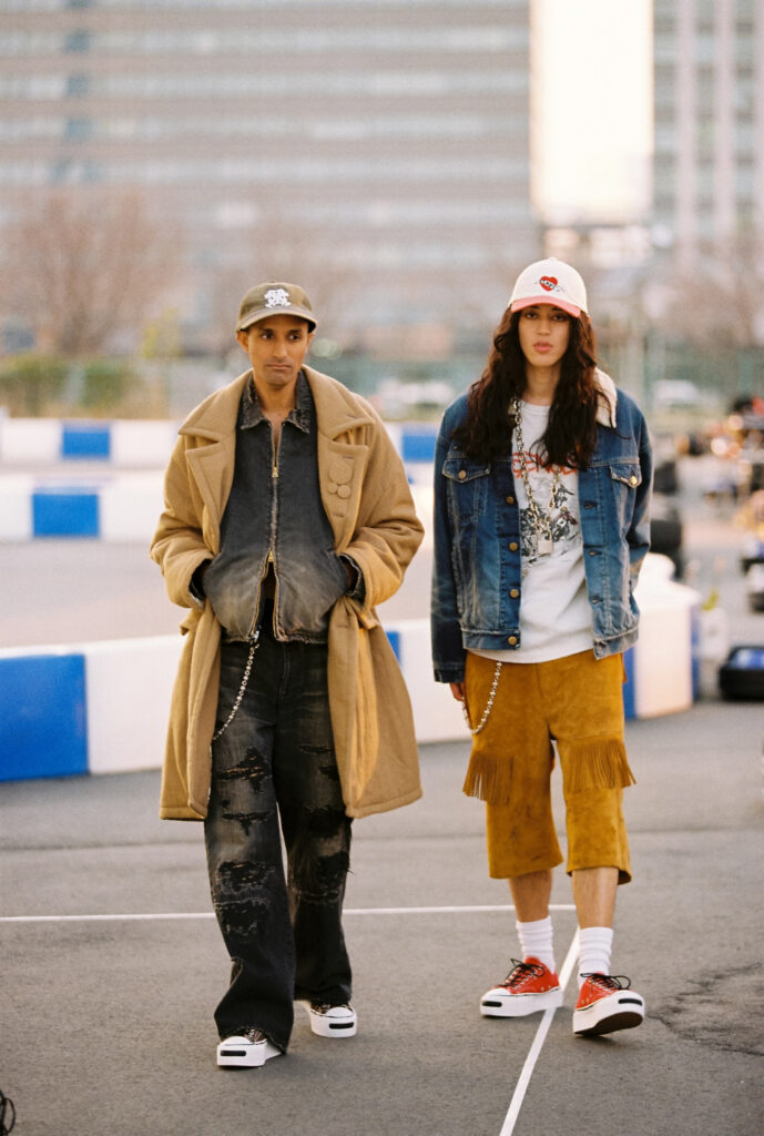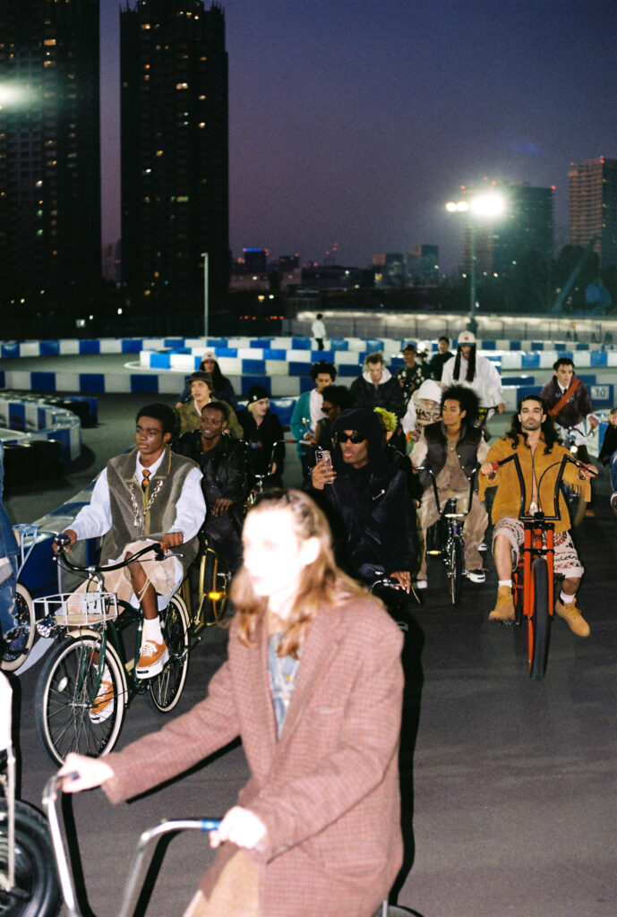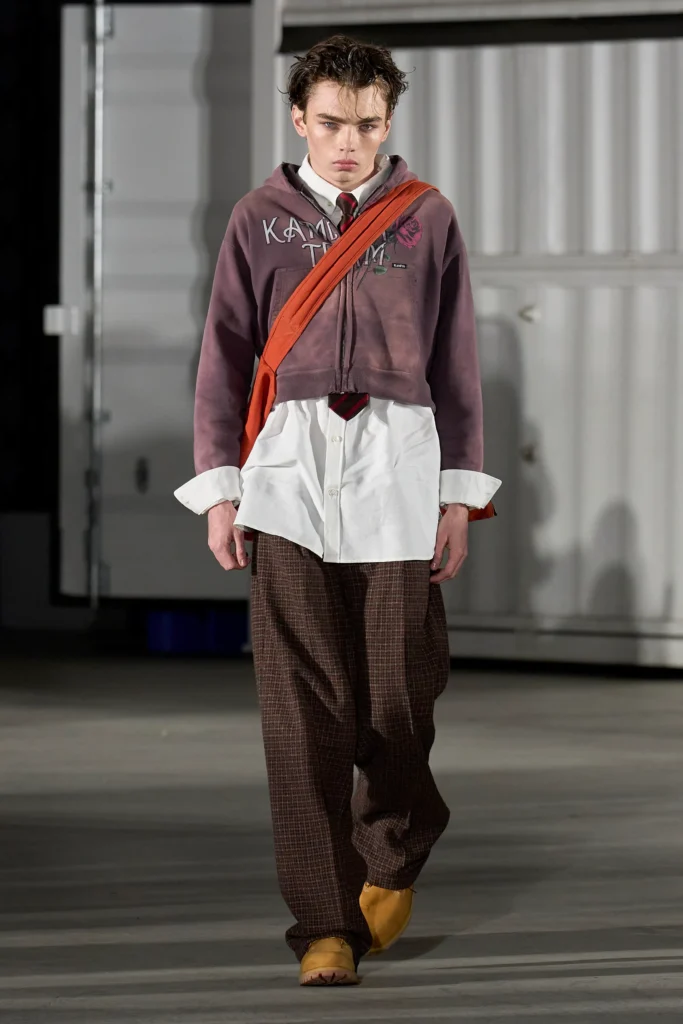 KAMIYA 2025 秋冬時裝展「Messenger」,由神谷康司在東京灣的一個卡丁車賽道舉辦,現場播放 1992 年英國樂團 Ride 的《Leave Them All Behind》,在壓軸時逐漸轉為古典音樂,模特們騎著 BMX 從一團煙霧中現身,沿賽道巡遊,呈現出濃烈的街頭魅力。這場設計靈感源於神谷先生對成長時期非電子化溝通方式的懷念。因此,他將本季系列命名為「Messenger」。