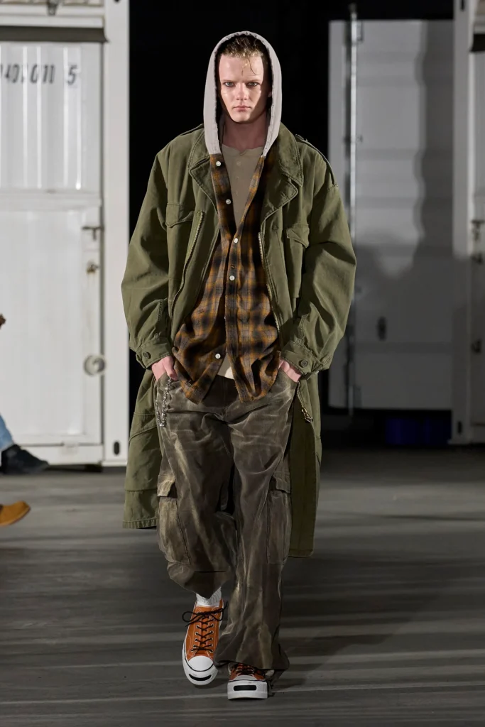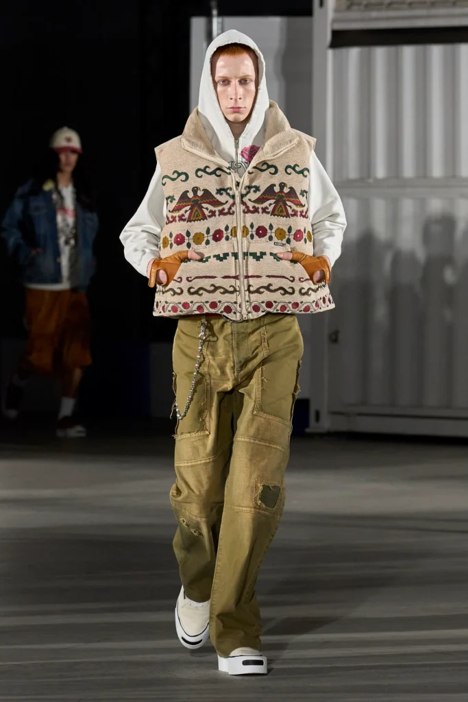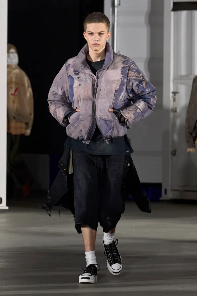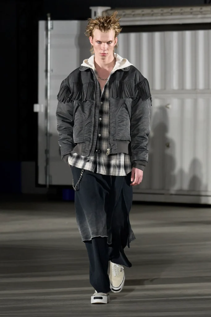 作為三原康裕的門生,神谷承襲了導師的頹廢美學精髓,但他的設計更注重實用性,融入 90 年代美式男裝的經典元素,並延續其標誌性的造舊工藝,呈現令人信服的磨損與復古質感,讓全新服裝彷彿從古著店中挖掘而出。本季系列中,破爛褪色恤衫、條紋毛衣、滑板短褲充滿 Kurt Cobain 氛圍。當中的尼龍 MA-1 空軍外套尤為引人注目,其流蘇設計展現了大膽的混搭趣味。