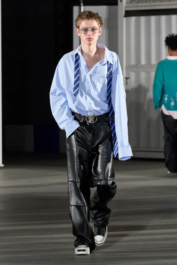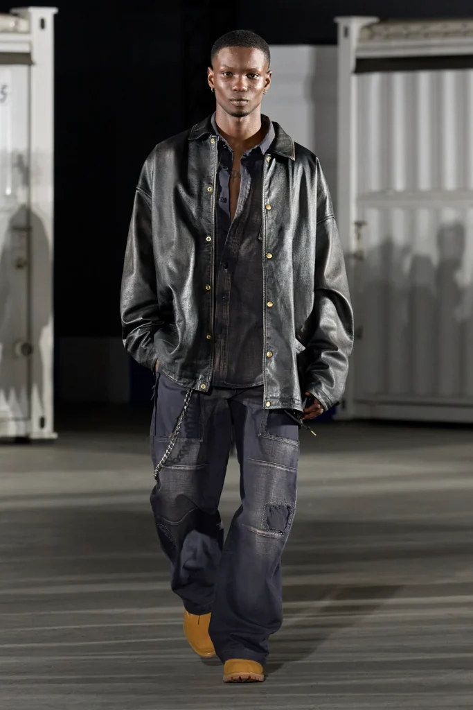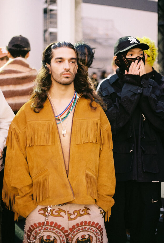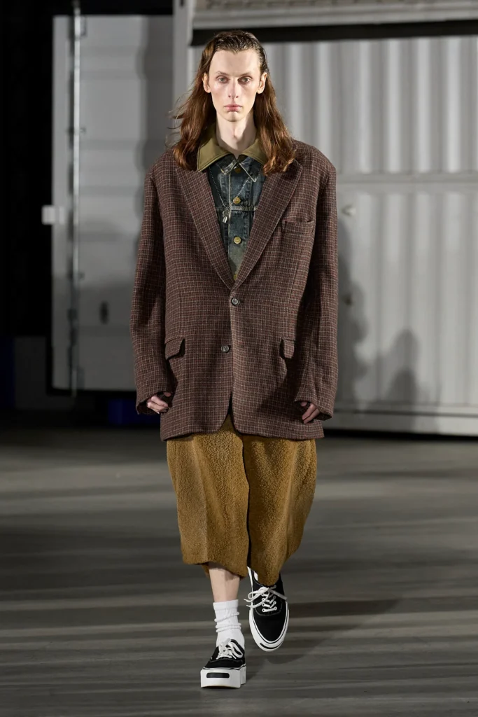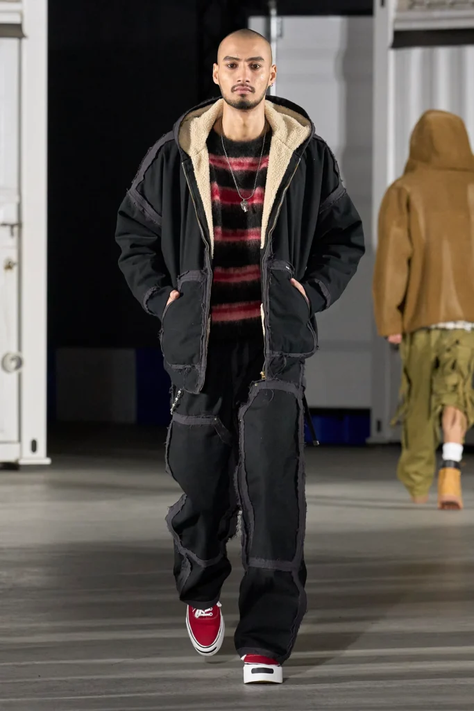 作為三原康裕的門生,神谷承襲了導師的頹廢美學精髓,但他的設計更注重實用性,融入 90 年代美式男裝的經典元素,並延續其標誌性的造舊工藝,呈現令人信服的磨損與復古質感,讓全新服裝彷彿從古著店中挖掘而出。本季系列中,破爛褪色恤衫、條紋毛衣、滑板短褲充滿 Kurt Cobain 氛圍。當中的尼龍 MA-1 空軍外套尤為引人注目,其流蘇設計展現了大膽的混搭趣味。