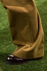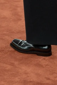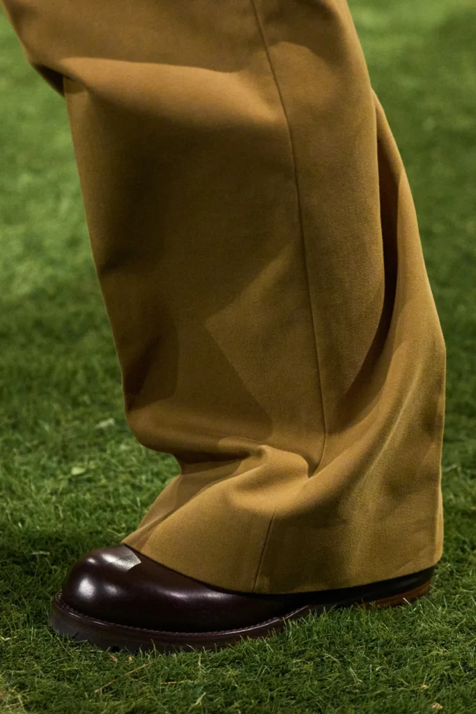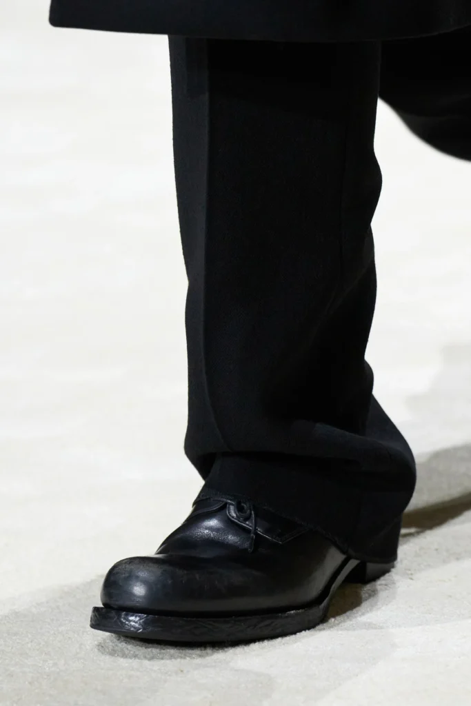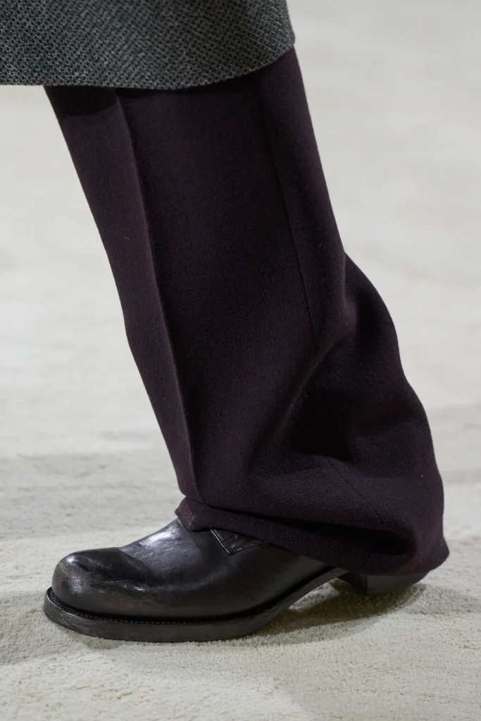 除了時尚達人的親身演繹,各大設計師品牌亦相繼推出各具風格的德比鞋款,進一步奠定其在男裝體系中的關鍵地位。在 Pharrell Williams 主理的 Louis Vuitton 2026 秋冬男裝展上,模特兒以寬鬆深黃色西裝搭配德比鞋,展現從容不失張力的高街氛圍;Miuccia Prada 與 Raf Simons 聯手打造的 Prada 2026 秋冬男裝展,則以灰色大衣配襯紫色西裝褲,腳下德比鞋低調點綴,為整體注入結構感與詩意;而 Jil Sander 則延續品牌一貫的簡約美學,以俐落線條與純粹材質演繹德比鞋,證明經典鞋款同樣可以承載極簡語彙。