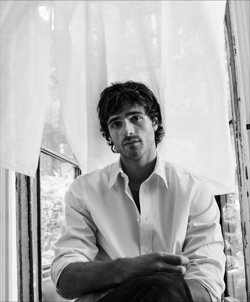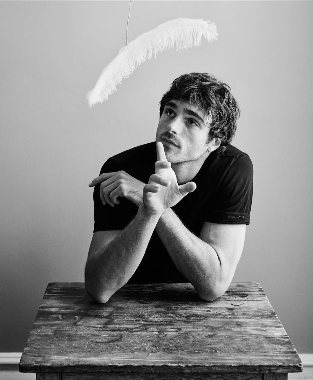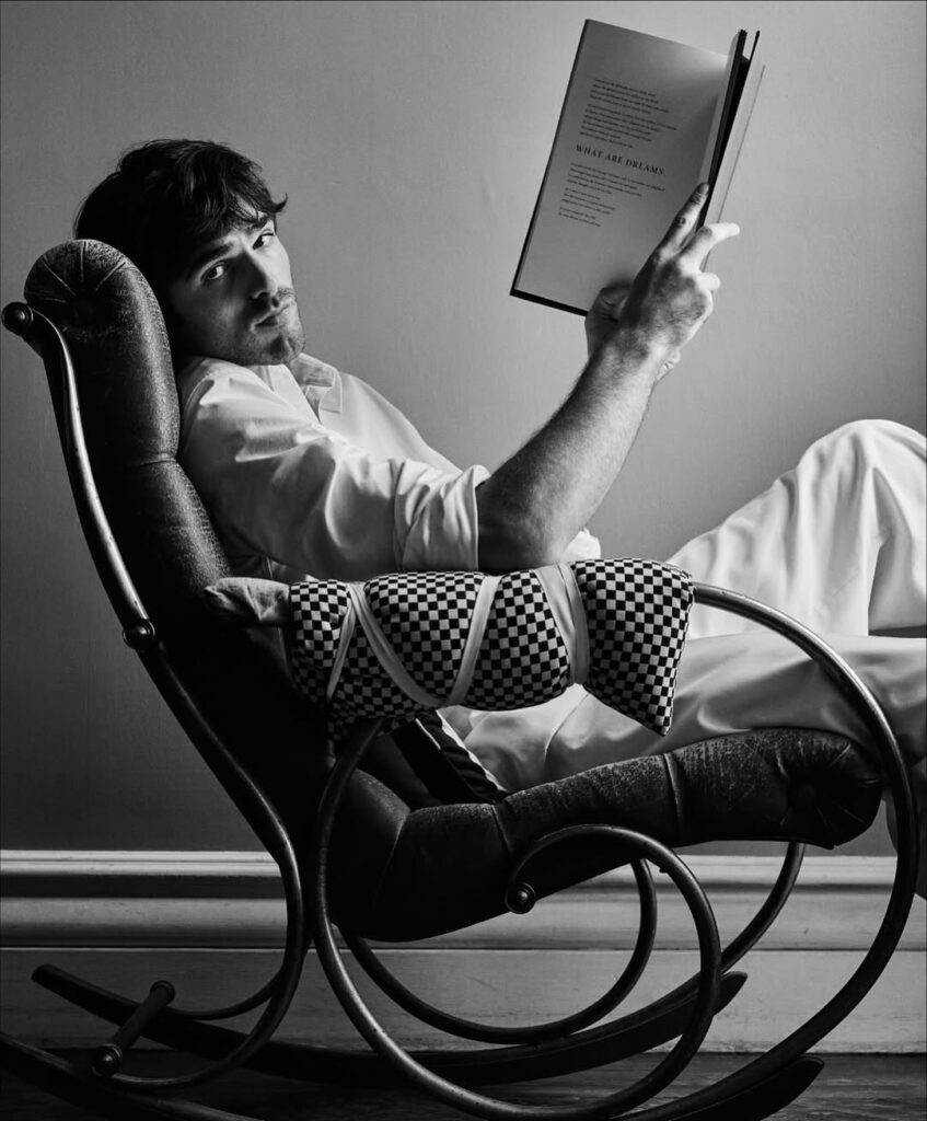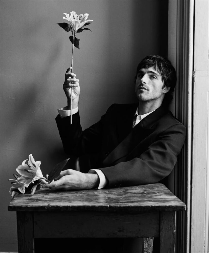 《What are Dreams》系列以黑白影像為基調,深入超現實主義的詩意領域,將真實與潛意識交織成一場視覺饗宴,宛如神秘莫測的私人劇場。整個系列於 Duane Michals 位於紐約格拉默西公園的私人寓所內完成拍攝。這位 1932 年出生、攝影生涯橫跨六旬的藝術家,將自家客廳轉化為幻變的舞台,捕捉 Jacob Elordi 在飄浮羽毛、凸面鏡、花朵與樹枝等道具間的深情互動。