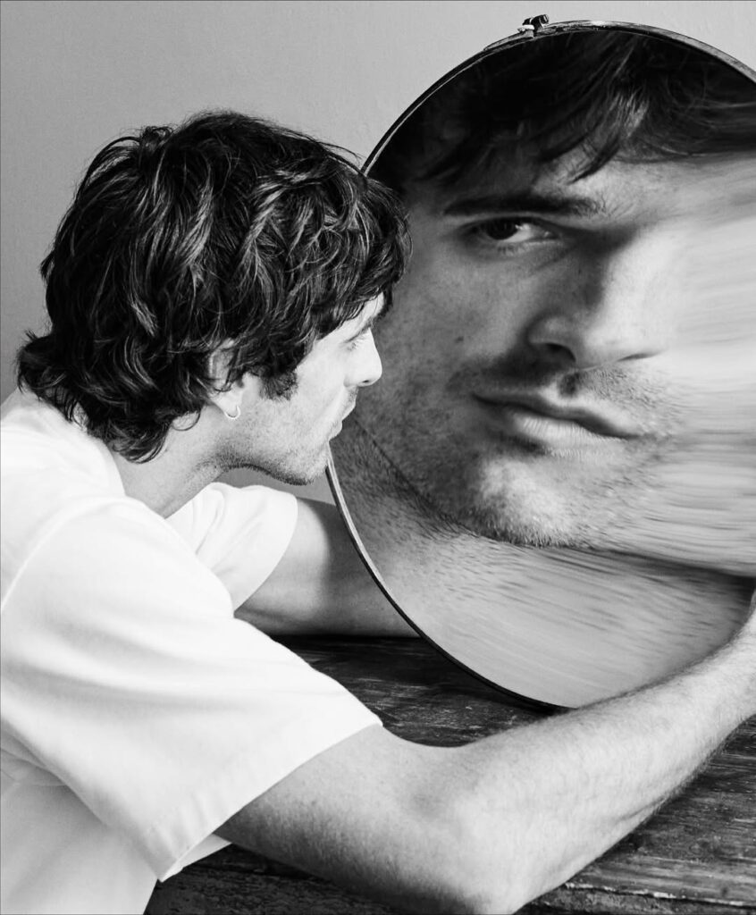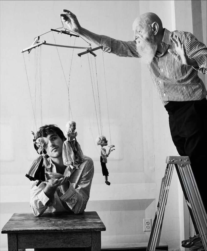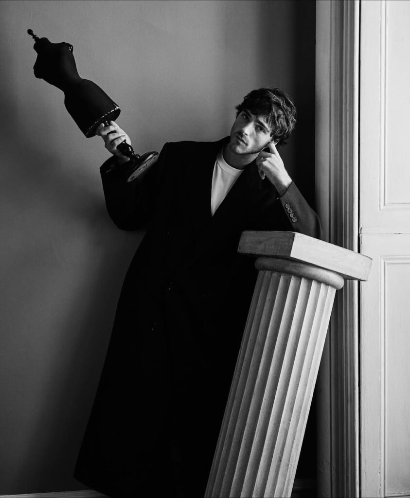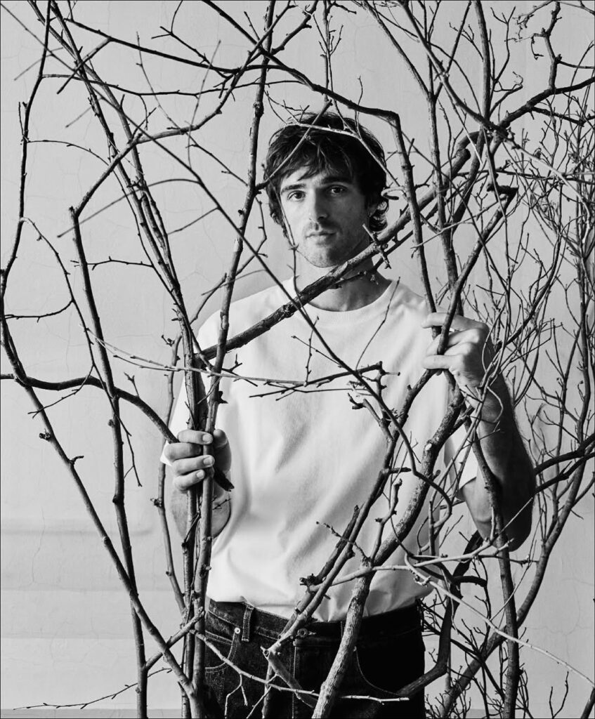 《What are Dreams》系列以黑白影像為基調,深入超現實主義的詩意領域,將真實與潛意識交織成一場視覺饗宴,宛如神秘莫測的私人劇場。整個系列於 Duane Michals 位於紐約格拉默西公園的私人寓所內完成拍攝。這位 1932 年出生、攝影生涯橫跨六旬的藝術家,將自家客廳轉化為幻變的舞台,捕捉 Jacob Elordi 在飄浮羽毛、凸面鏡、花朵與樹枝等道具間的深情互動。