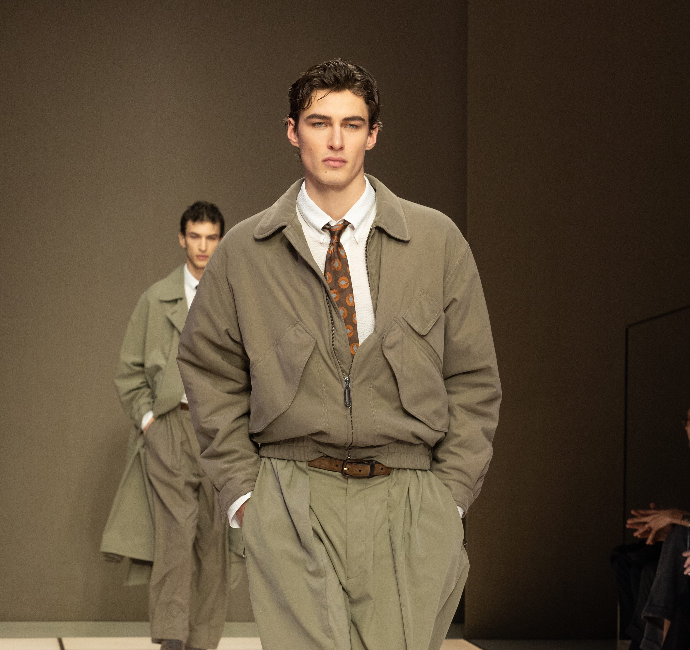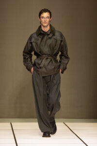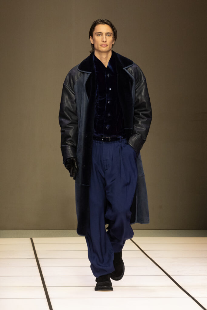 Dell’Orco 的首秀並非顛覆,而是輕柔地注入新意。這場展包含 136 套造型,融合經典與微妙創新,緩緩在觀者眼前展開。光影對比成為主軸,豐富的色調如潮水般湧現:品牌標誌性的流光物料,那些可變幻絲綢與絨面織物,巧妙融入拉絨羊絨、羊毛氨,以及觸感豐盈的啞光皮革。這些元素在模特兒的步伐間變幻莫測,時而閃爍,時而貼服,締造出無盡的層次感。色調以灰階、米色、中性調、黑色與深藍為基底;點綴其間的橄欖綠、紫晶色及青金石藍,則如寶石般脫穎而出,為造型注入一絲大膽的詩意。