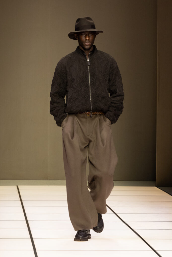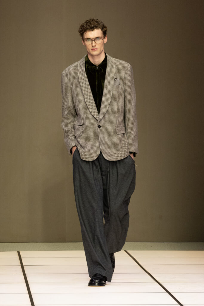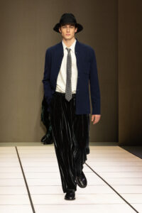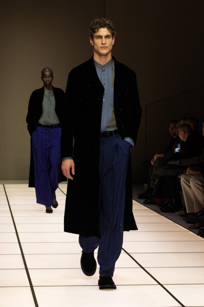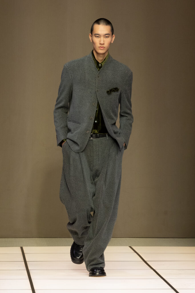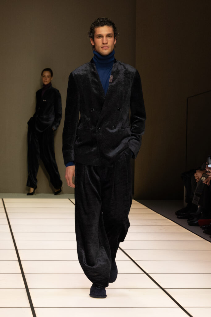 冬季款式以修長西裝和大衣為核心,流線型剪裁遇上寬闊比例,營造出與身體互動的空間感。褲裝則偏好寬腿設計,配以鬆肩毛衣或低鈕扣夾克,強調非拘束的日常奢華。藍絨無領夾克配灰色法蘭绒褲,或橄欖綠絲絨套裝,皆在光線下展現出「Cangiante」的魔力——表象多變,本質卻一脈相承。
